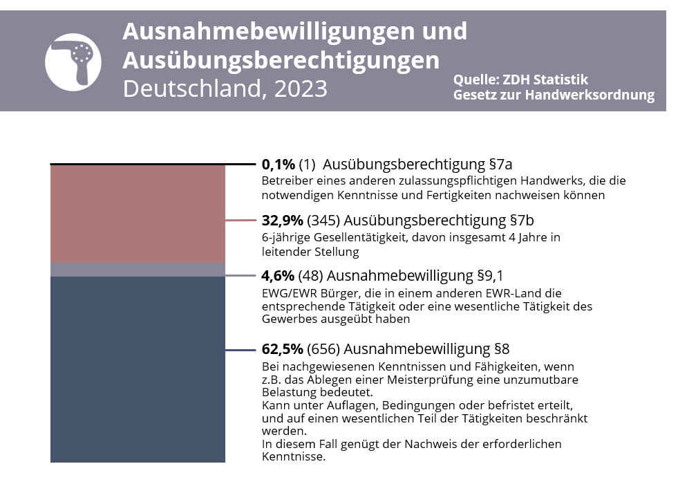 Die Anzahl der erteilten Ausnahmebedingungen hält sich seit 2015 mit minimalen Schwankungen konstant. 2023 wurden 1.050 Ausnahmebewilligungen und Ausübungsberechtigungen erteilt. 4,6 % der Ausnahmebedingungen wurden in Verbindung mit EWR-Bürgern nach §9,1 erteilt. Knapp ein Drittel der Ausnahmen wurden an Gesellen mit mindestens 4 Jahre leitender Stellung im Salon erteilt und lediglich eine Ausübungsbewilligung für einen Betreiber eines anderen Handwerks. Die Mehrheit, 62,5 %, der erteilten Ausnahmen sind auf §8 der HwO zurückzuführen. Ob diese für das Friseurhandwerk ganzheitlich, auf Teilbereiche und gegebenenfalls auf welche dieser beschränkt, erteilt wurden, wird nicht erhoben. Es lässt sich also nicht klar sagen, dass diese mehrheitlich Teilbewilligungen zum Herrenfriseur darstellen.