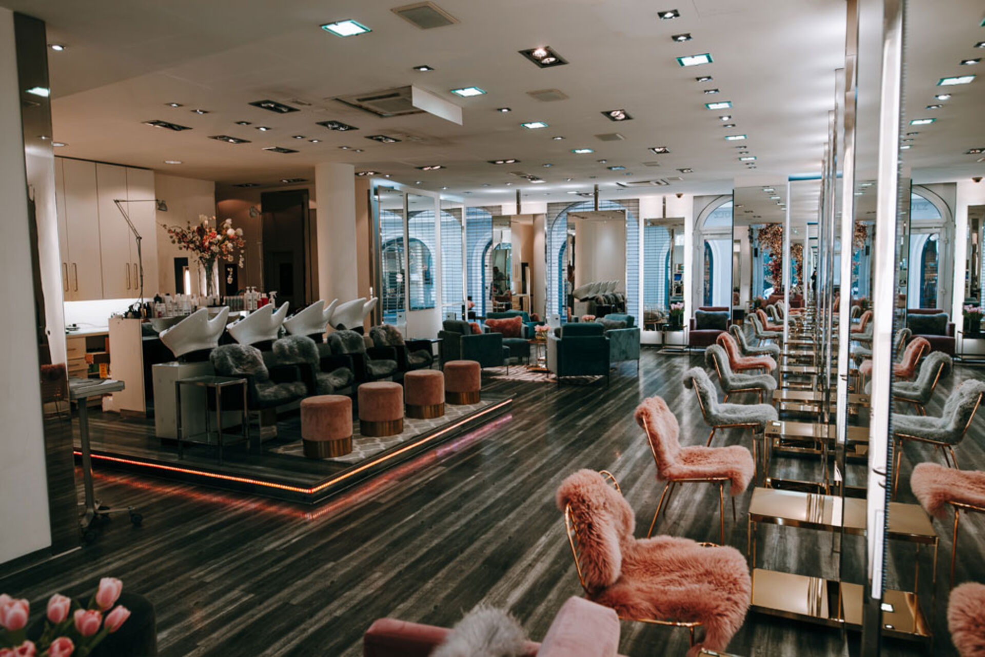 Eine moderne Arbeitsatmosphäre, bei der der Kunde nicht das Gefühl hat, er säße beim Friseur. Rosé- und mintfarbene Felle, Teppiche und Loungemöbel machen den großen Raum authentisch und sorgen für den Harmonieausgleich der Farben. Auf einer Empore befindet sich der Haarwaschbereich. Auch hier ist schicker Comfort oberste Priorität, weswegen die Frisierstühle mit flauschigen Fellen überzogen sind. Der samtige Traum spiegelt sich in den Loungemöbeln wider, die auf Zebragemusterten Teppichen stehen. Goldene Tischchen und üppige Blumendekorationen füllen die Größe des Salons und sorgen für Gemütlichkeit. Imposant und modern zeigt André Schulz' Salon, wie sich Luxus authentisch umsetzen lässt.