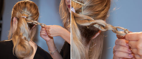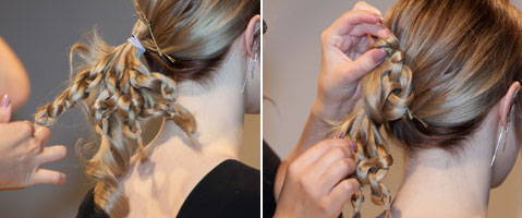Step 1| Die Harare zu einem seitlichen Zopf zusammenbinden, mit einem Haargummi fixieren.
