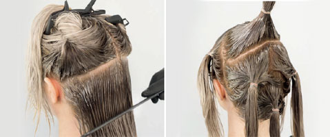 Step 2| Platzierung der Strähnensektionen. Dazu werden mithilfe von Zopfgummis ca. 6 Abbunde erstellt.