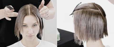 Step 9| Einen radialen Scheitel von Ohr zu Ohr quer über die Krone ziehen. Dann einen zentralen, vertikalen Scheitel von der Haarkrone bis in den Nacken ziehen, das Haar kämmen und auf 90 Grad zur Kopfrundung abheben. Die Ecke im Point-Cut schneiden um die Form weicher erscheinen zu lassen.