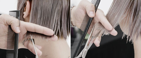 Step 2| Zwei horizontale Partien von unter dem Okzipital-Knochen bis zur Mitte der Ohren abteilen. Haare im natürlichen Fall kämmen, auf 45 Grad abheben und im Point-Cut parallel zum Scheitel schneiden um im Nacken eine horizontale Graduation zu erhalten.