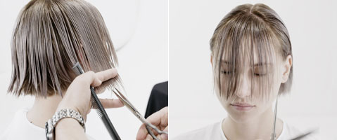 Das Haar mit Dumb Blonde Shampoo & Reconstructor waschen. Control Freak Serum als Schneidelotion auftragen.