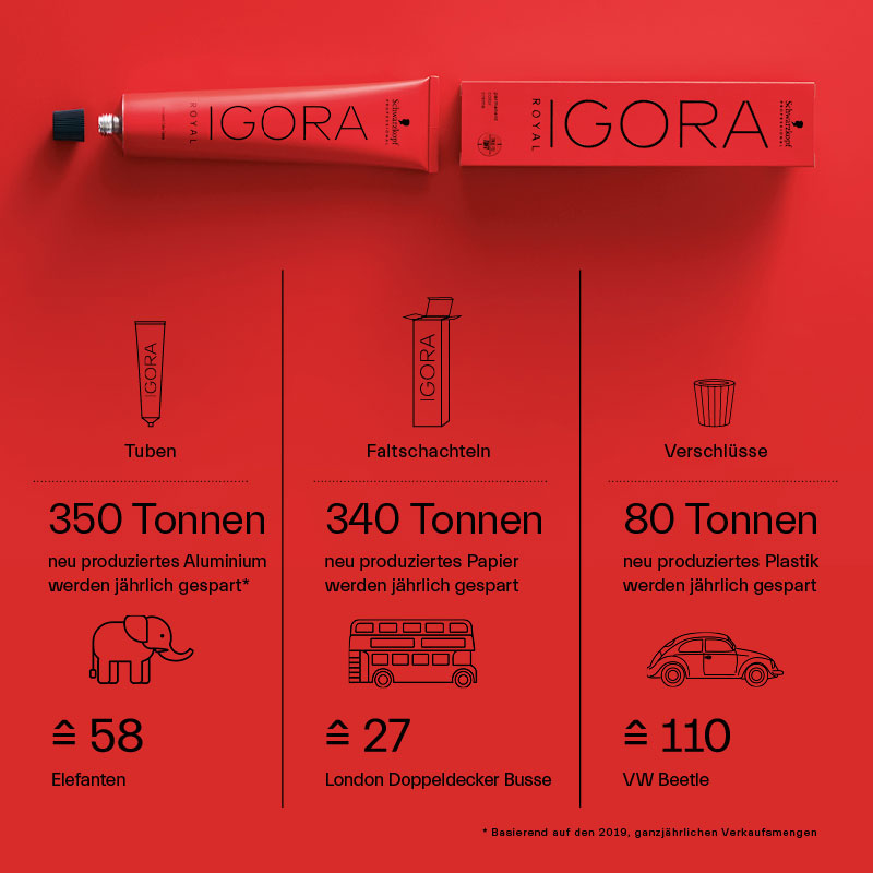 Darüber hinaus setzt Igora auf Nachhaltigkeit, was den CO2-Fußabdruck im Salon reduzieren kann. Die Igora Royal Tuben bestehen aus 100% recyceltem Aluminium. Das spart im Jahr 350 Tonnen, dem Gewicht von 54 Elefanten. Die Verpackungsboxen werden aus mind. 92% recyceltem Papier hergestellt, was 340 Tonnen und auch ein paar Elefanten ausmacht. Die Verschlusskappe wird aus 100% recyceltem Plastik hergestellt. Das spart 80 Tonnen Plastik.