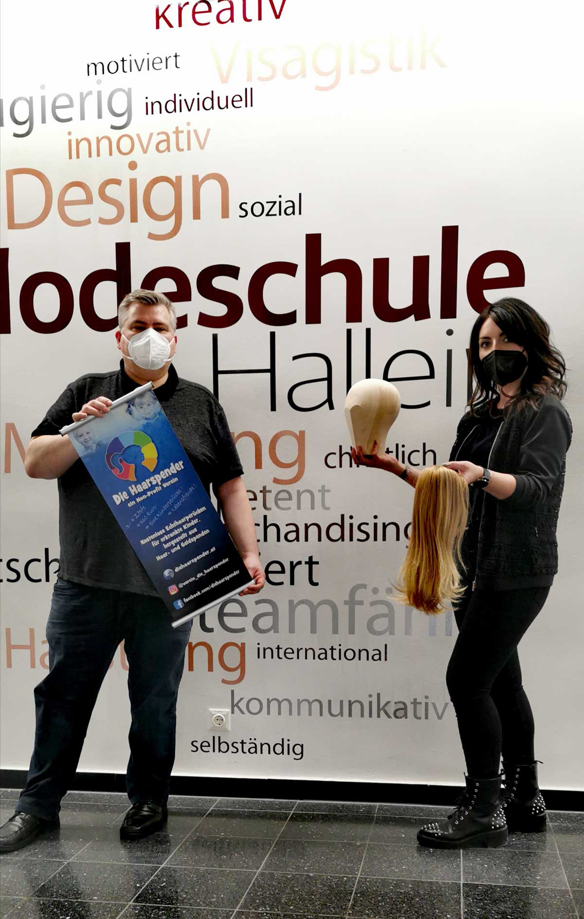 Holger Möller, Verein "die Haarspender" und Nadja Wuggenig, Modeschule Hallein, freuen sich über Unterstützer | Modeschule Hallein