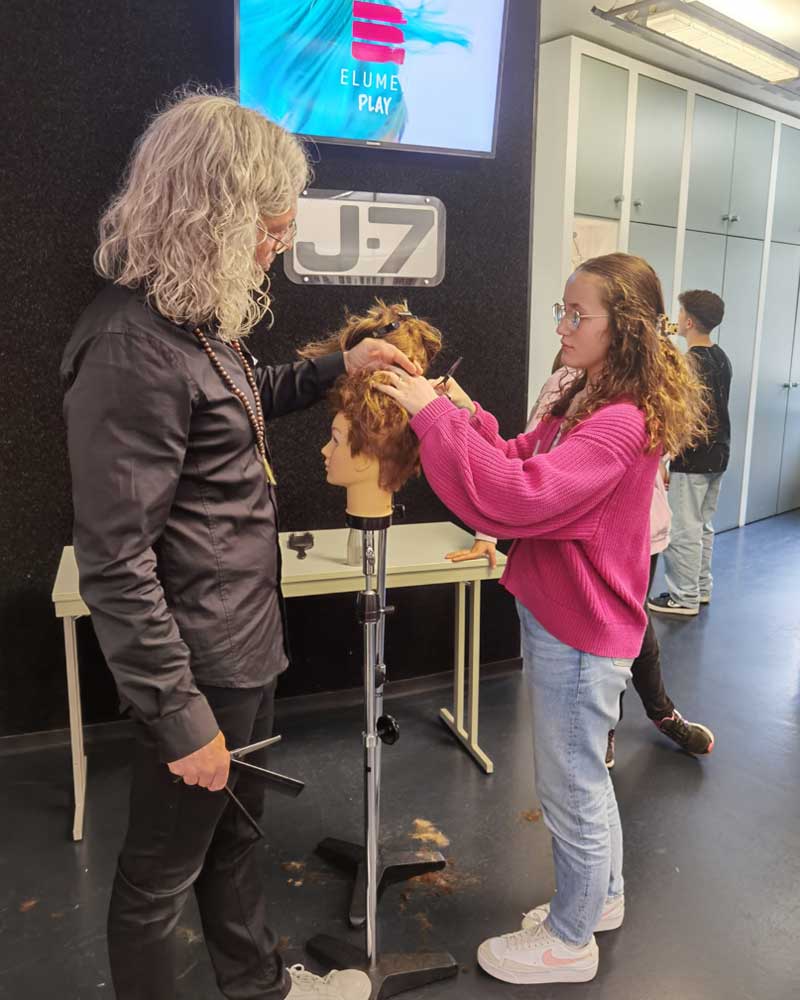Die Profis erklären den Jugendlichen, was sie in der Ausbildung erwartet und was sich ein Friseurunternehmen von ihnen erwartet. Sie lassen Auszubildende zu Wort kommen und klären auf, welche Möglichkeiten Menschen im Friseurhandwerk haben: als Salonmanagerin, Trainer, Meister oder Fachlehrerin usw. Die Teilnehmenden dürfen auch praktisch arbeiten: Sie setzen Strähnen, lernen den Umgang mit dem Glätteisen, erfahren etwas zur Handhabung einer Friseurschere und dürfen sich mit einer Schneidemaschine am Trainingskopf ausprobieren.