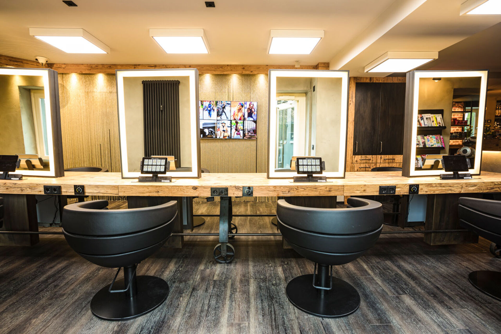 - Ein Display in jedem Spiegel zeigt den Namen des jeweiligen Kunden, seines Hairdressers und die gebuchte Leistung.
