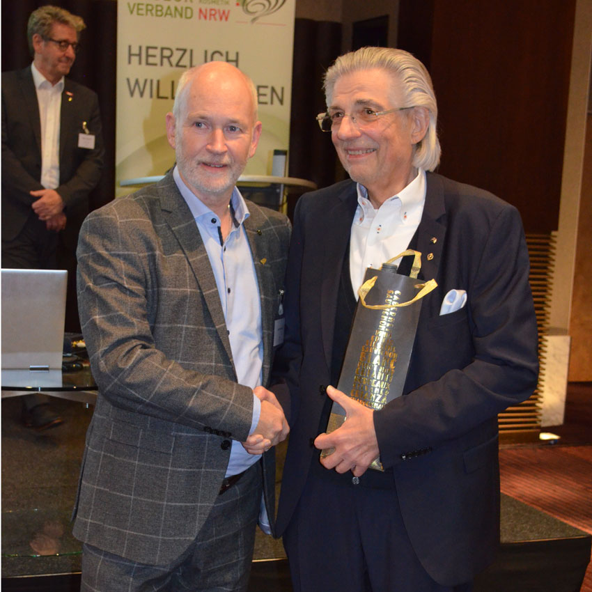 Zum Abschluss der Tagung erfolgten einige Ehrungen. Als erstes wurde Joachim Castor, für seinen langjährigen Einsatz für das Nordrhein-Westfälische Friseurhandwerk mit der Golden Ehrennadel des Verbandes ausgezeichnet. Goldene Ehrennadeln des Zentralverbandes für langjährige Ehrenamtsarbeit wurden an Ingo Lanowski, Mike Engels und Rüdiger Stroh von der Präsidentin persönlich überreicht. Mit sehr persönlichen Präsenten wurden das ehemalige Vorstandsmitglied Volker Haimann und der langjährige Mitarbeiter der Geschäftsstelle des Verbands Wolfgang Haupt überrascht. Volker Haimann erhielt darüber hinaus die Ehrenmitgliedschaft des Verbandes und Wolfgang Haupt wurde in den wohlverdienten Ruhestand verabschiedet.