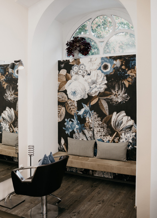 Mit Wiener Altbau-Charme besticht Your Choice in der City durch Wärme und perfekt eingesetzte Akzente. Smart platzierte Elemente, wie die Leinen-Vorhänge mit Blumen-Optik, schirmen vom Trubel der Außenwelt ab. Die historischen Elemente der Altbaufenster bleiben aber sichtbar und sorgen für warmes Sonnenlicht. Blumen-Elemente in Petrol, die sparsam, dafür bewusst platziert wurden, vermitteln ein New-Retro Feeling. Ganz Japandi wirken die präsentierten Produkte fürs Auge angenehm kuratiert. Vasen in organischer Form werden als Signature Piece an der Rezeption eingesetzt und auch die Spiegel am Arbeitsplatz sind groß und rahmenlos. Sie sorgen gerade deshalb für absolute Ruhe. Als Deko werden ein Retro-Radio, japanisches Tee-Geschirr und eine Lavalampe mit viel Grünen Pflanzen, stehend sowie hängend, eingesetzt.