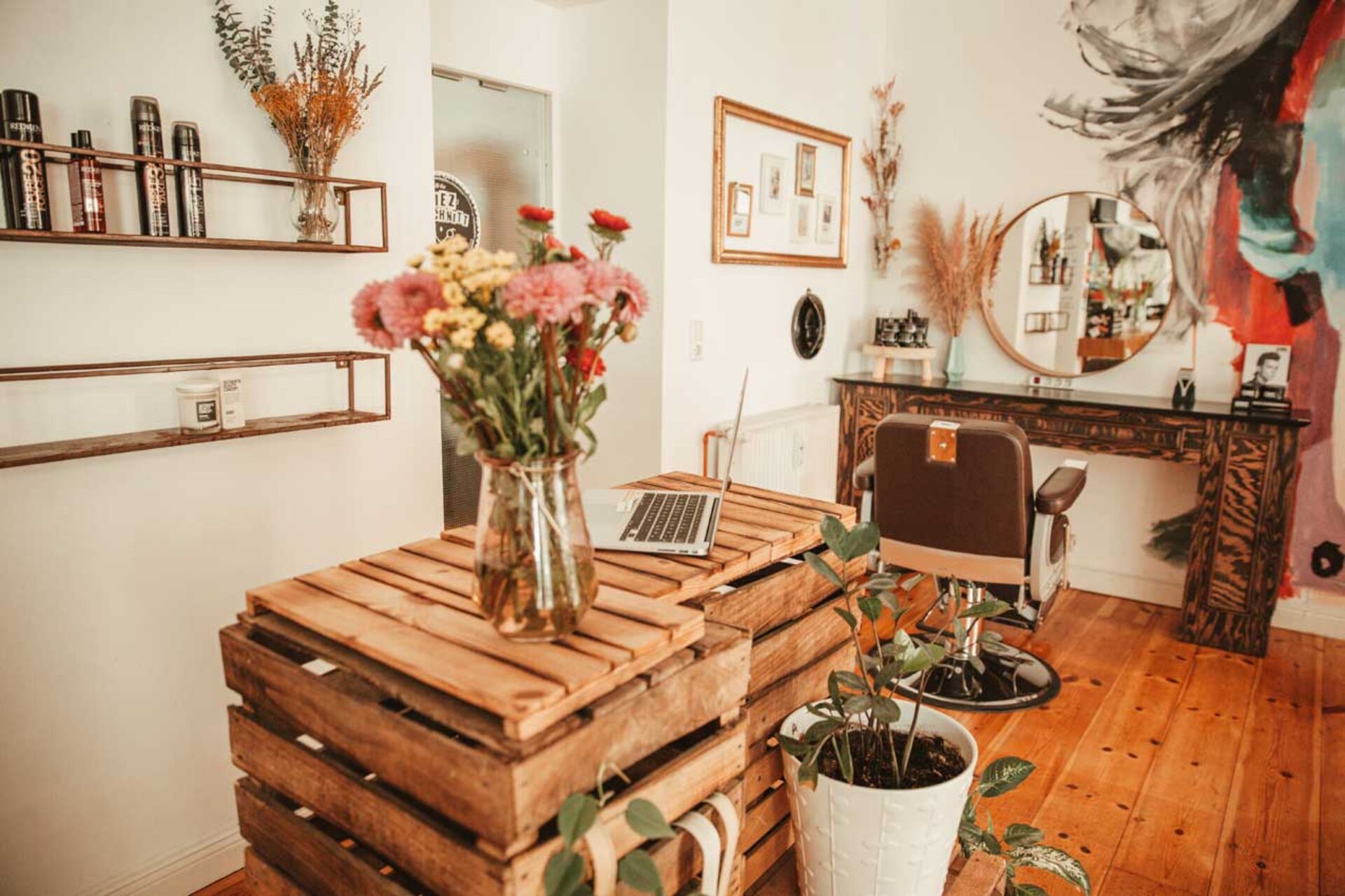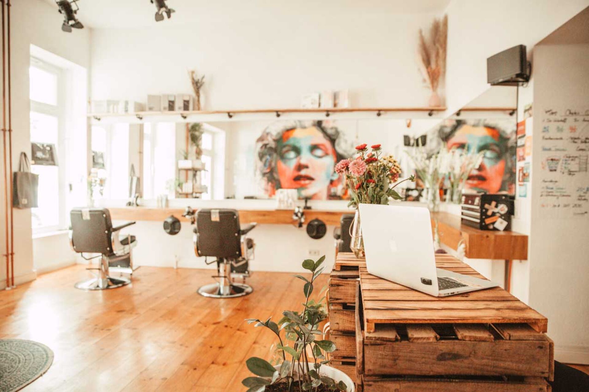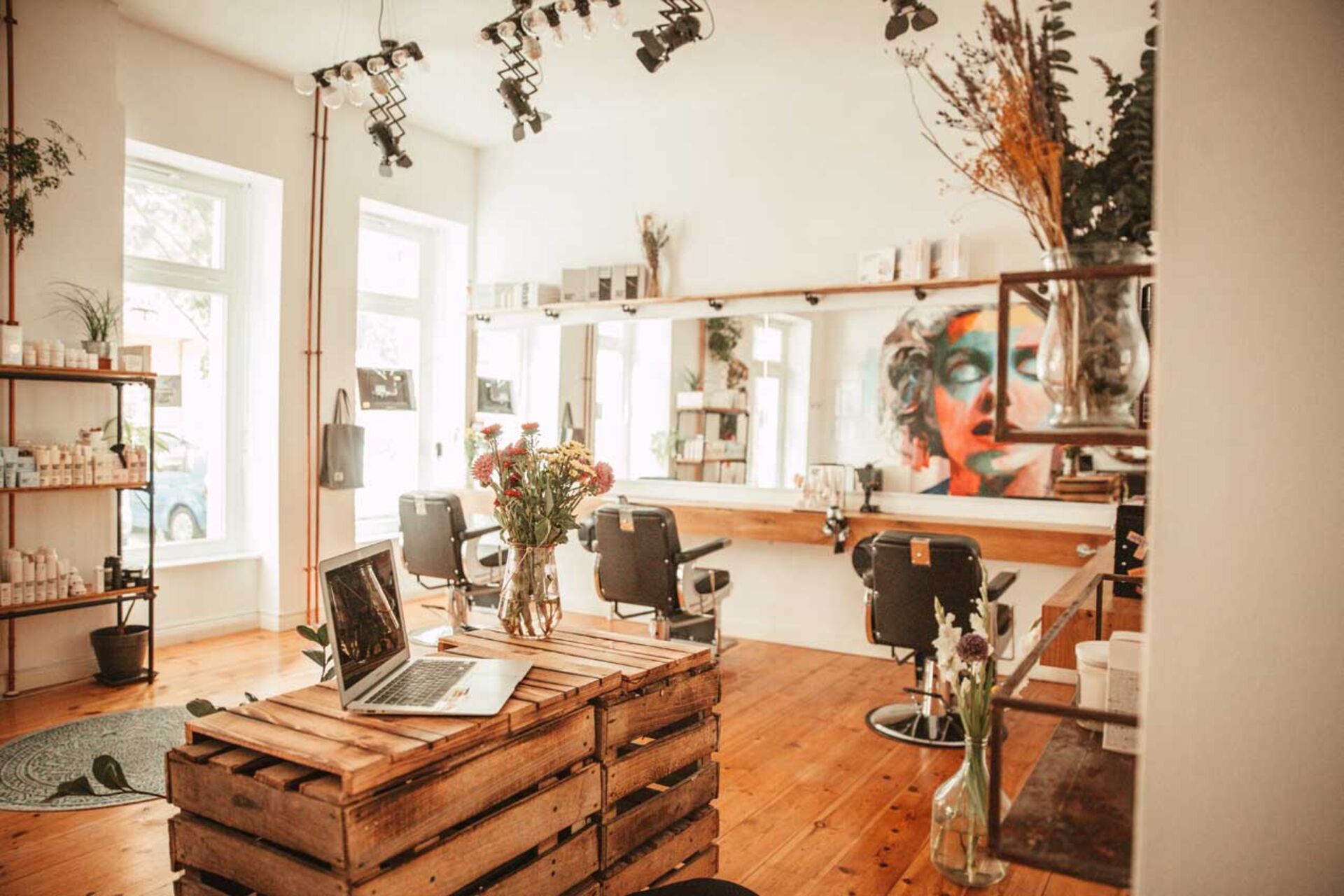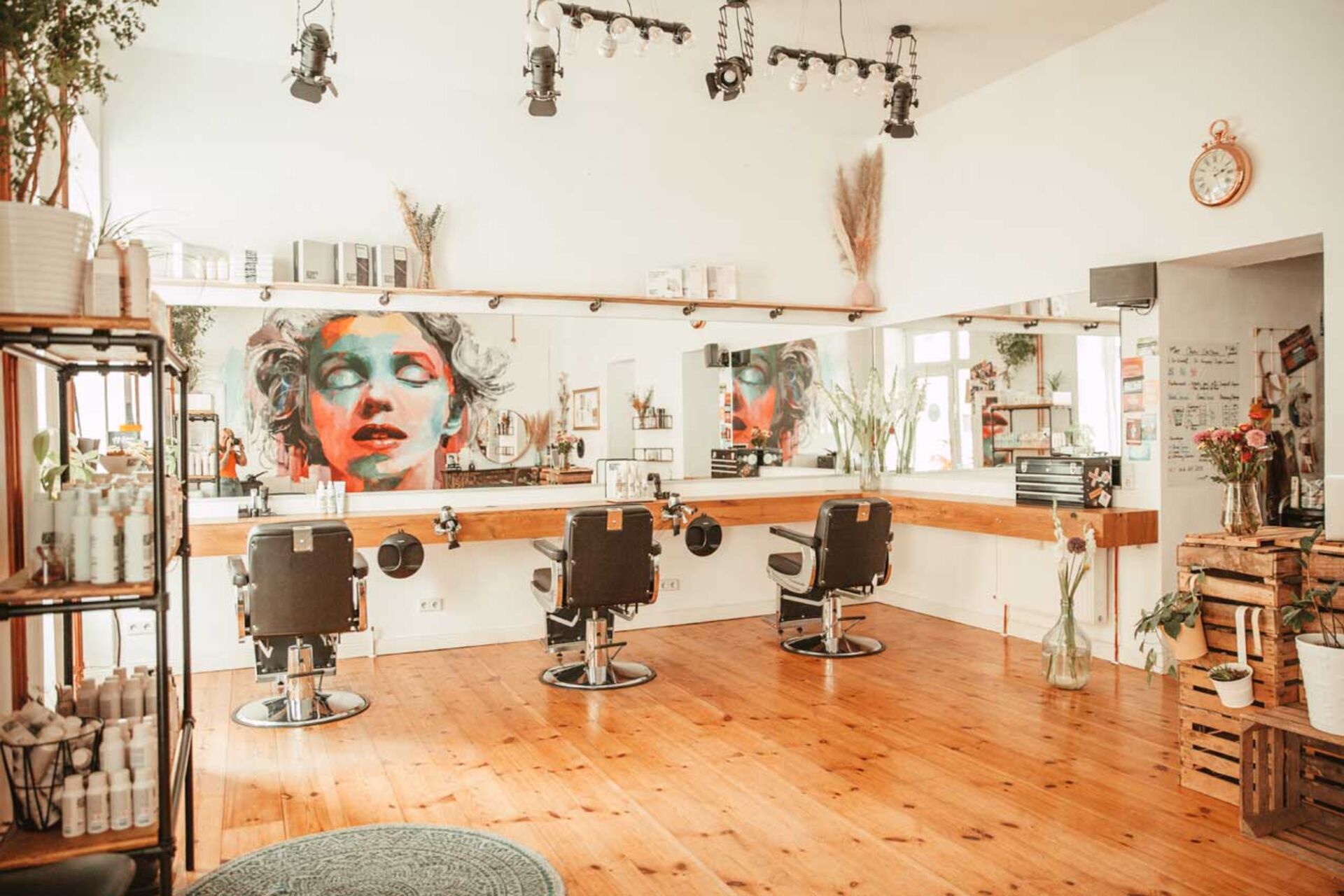 Sina Stegner war es wichtig, den Laden nicht friseurtypisch einzurichten. Mit vielen gebrauchten Möbeln konnte sie nicht nur Geld sparen, sondern hat auch den ein oder anderen Vintage-Eyecatcher in ihrem Salon. Geflammte Weinkisten wurden zu einem schicken Tresen umfunktioniert, auf dem bunte Blumen in einer großen Vase ihren Platz finden konnte. An der hohen Decke hängen Glühbirnen und kleine Lampen im Studiostil, die mit Mini-Scheinwerfern das perfekte Licht möglich machen. Dank der hohen Decken und Fenster wirkt der Raum auch ohne das Scheinwerferlicht noch größer und heller. Besonders stolz ist die Friseurmeisterin auf ihr Wandgemälde von Brad Robbson der für den Salon Marylin Monroe gemalt hat.