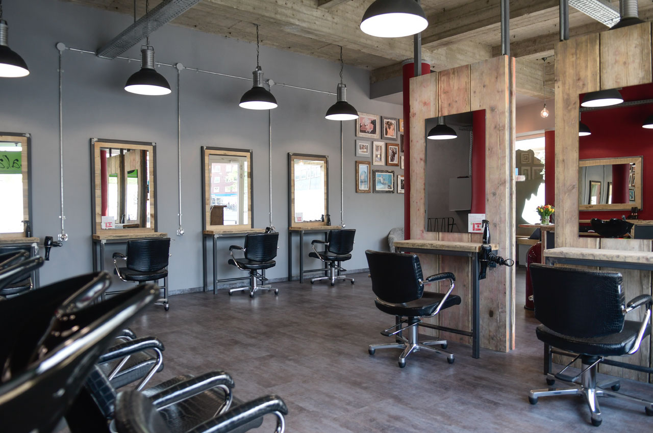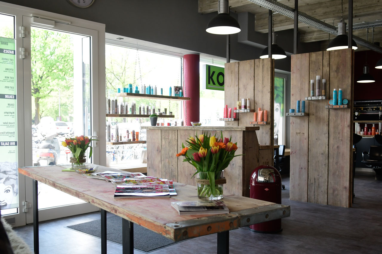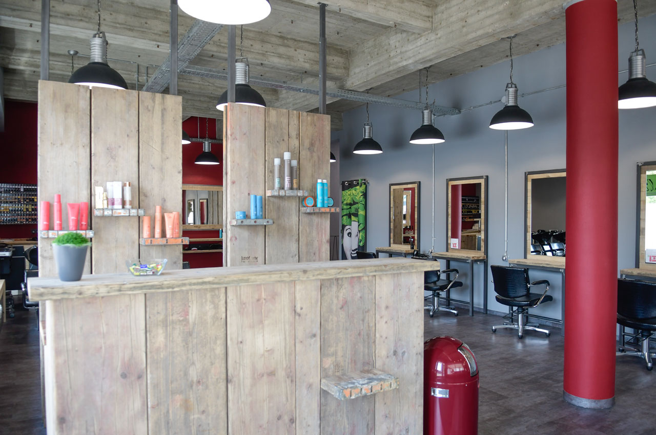 "Es läuft!" für Taifun Yalcin, denn mittlerweile eröffnete der Salonbesitzer seinen 5. "Kopfsalat"-Salon im Münster Zentrum. Bei dieser Filiale wollte er einen Fabrik-Look mit gemütlicher Atmosphäre schaffen. Heißt: Rustikale Holz-Einrichtungselemente und Schalbretter, sowie eine offene Decke mit sichtbaren Balken wurden mit modernen Sitzmöbeln aus Leder und warmen, gediegenen Farben kombiniert. Die Spiegelrahmen und Tische an den 6 Bedienplätzen passen sich dem Stil an. Die Deckenleuchten unterstreichen den urbanen Manufaktur-Look.