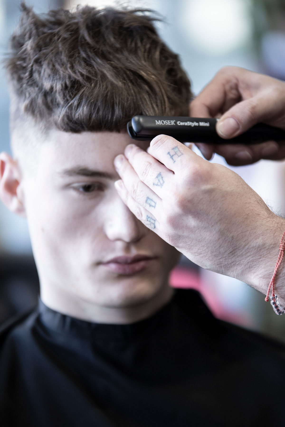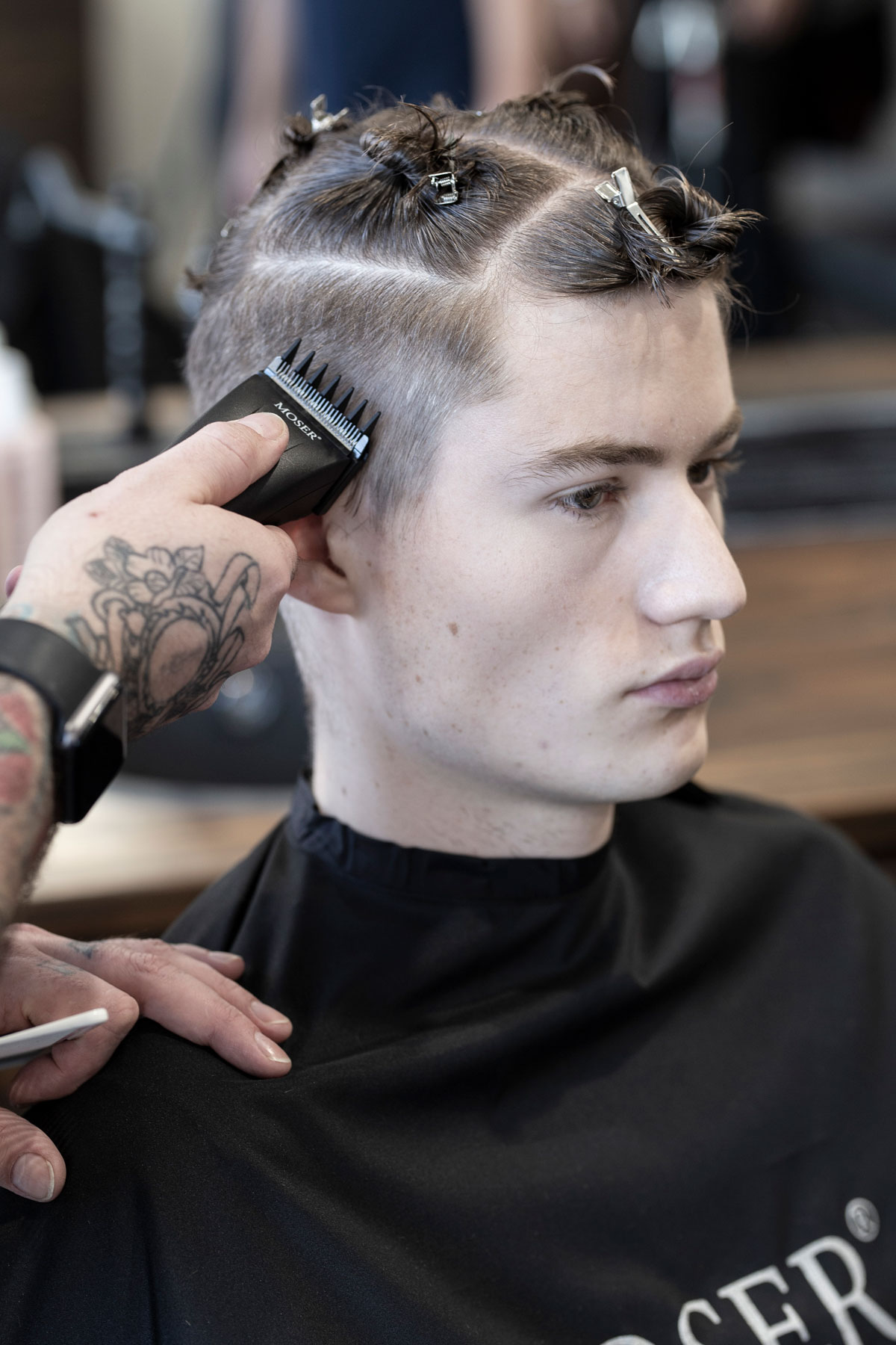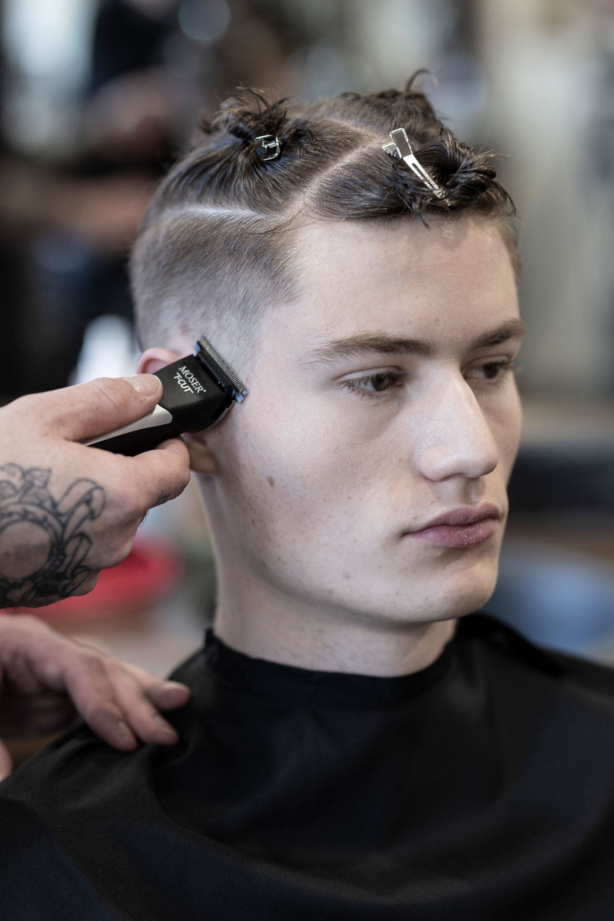 Der Schnitt made by MOSER verbindet verschiedene Stylingelemente wie einen maskulinen Fade im Nacken- und Seitenbereich, wild gestyltes Deckhaar mit perfekter Textur und kreative Akzente im Vorderkopfbereich.