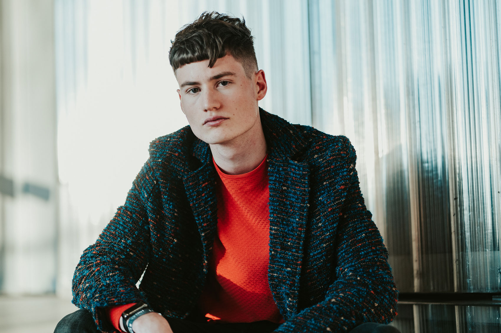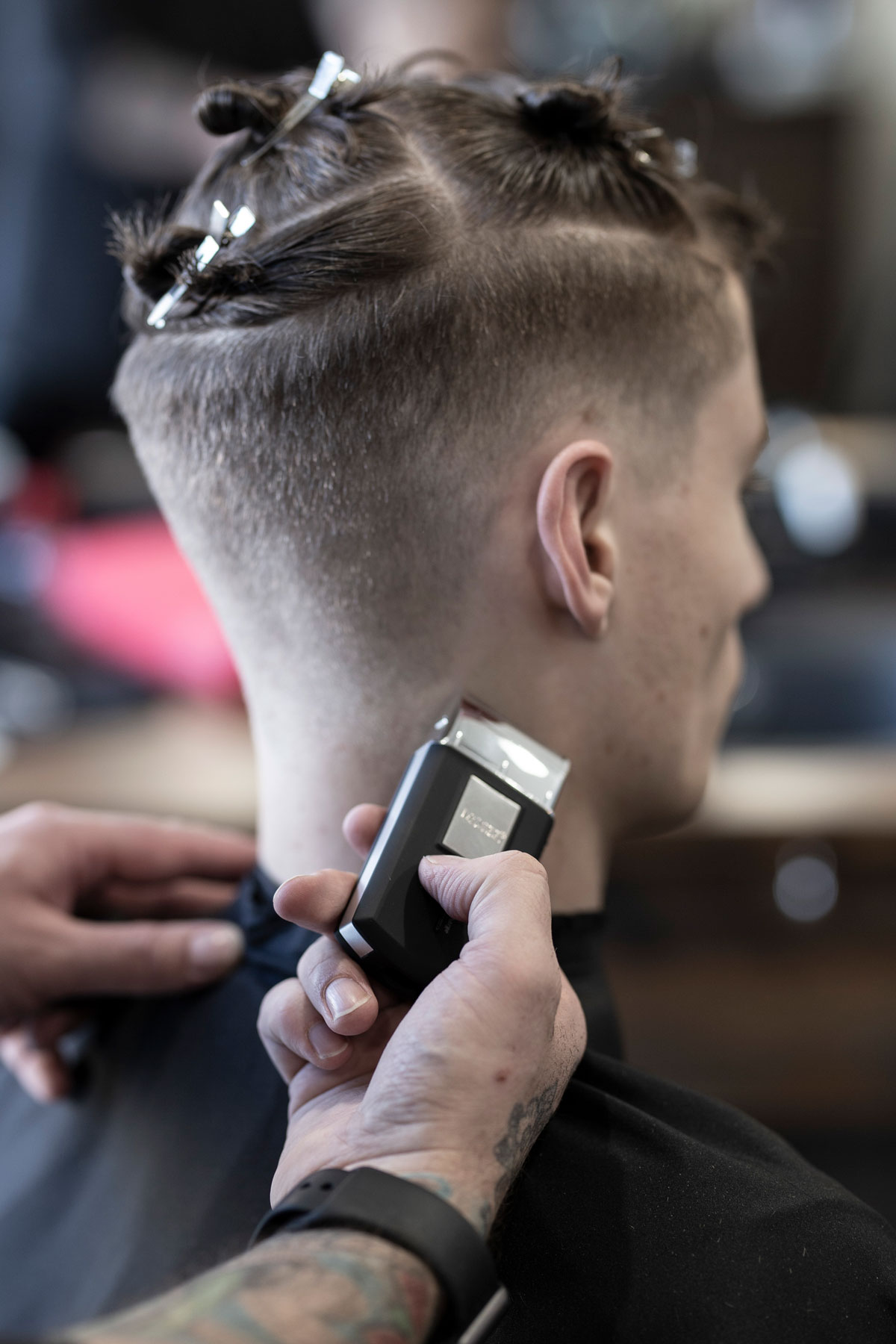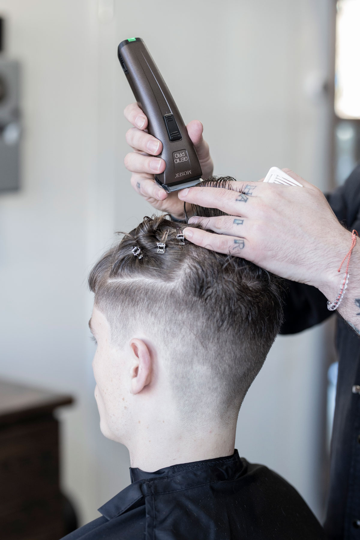 Der Schnitt made by MOSER verbindet verschiedene Stylingelemente wie einen maskulinen Fade im Nacken- und Seitenbereich, wild gestyltes Deckhaar mit perfekter Textur und kreative Akzente im Vorderkopfbereich.