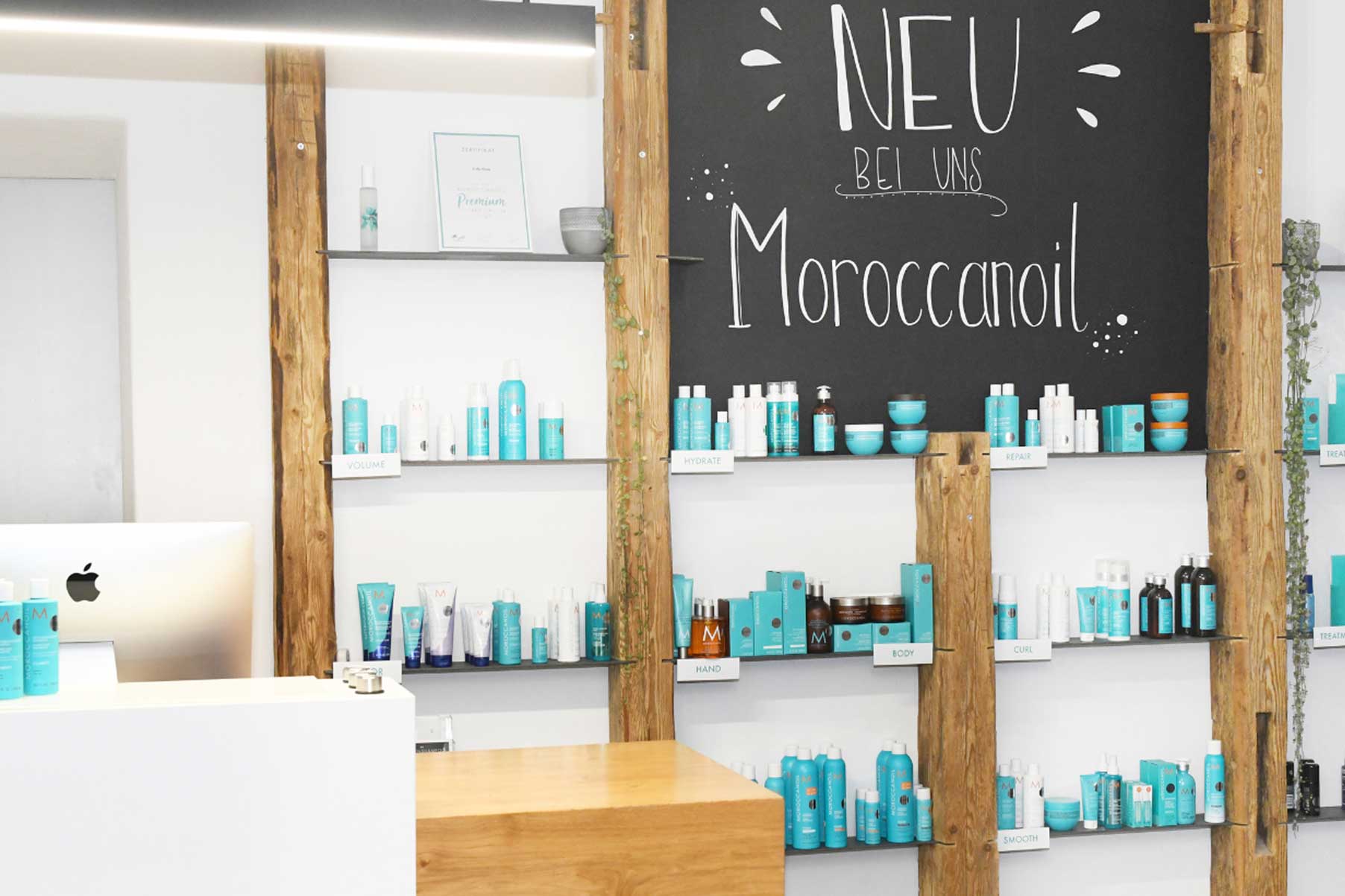 Trotz Holz-Stil wirkt der Innenraum nicht zu überladen und reduziert. Dafür hat sich Erika Ploum mit ihrem Team dazu entschieden, den Produkten genügend Raum zu bieten. Mit Gieseke und Moroccanoil als Produkt-Partner sind die türkisen Packagings die bunten „Highlights“ im Salon. Das volle Commitment zur Marke Moroccanoil spiegelt sich auch im Team-Outift – in Form von türkisen Shirts – sowie den Handtüchern in Türkis wider. Beides hebt sich vom sonst farblich schlicht gehaltenem Ambiente besonders ab.