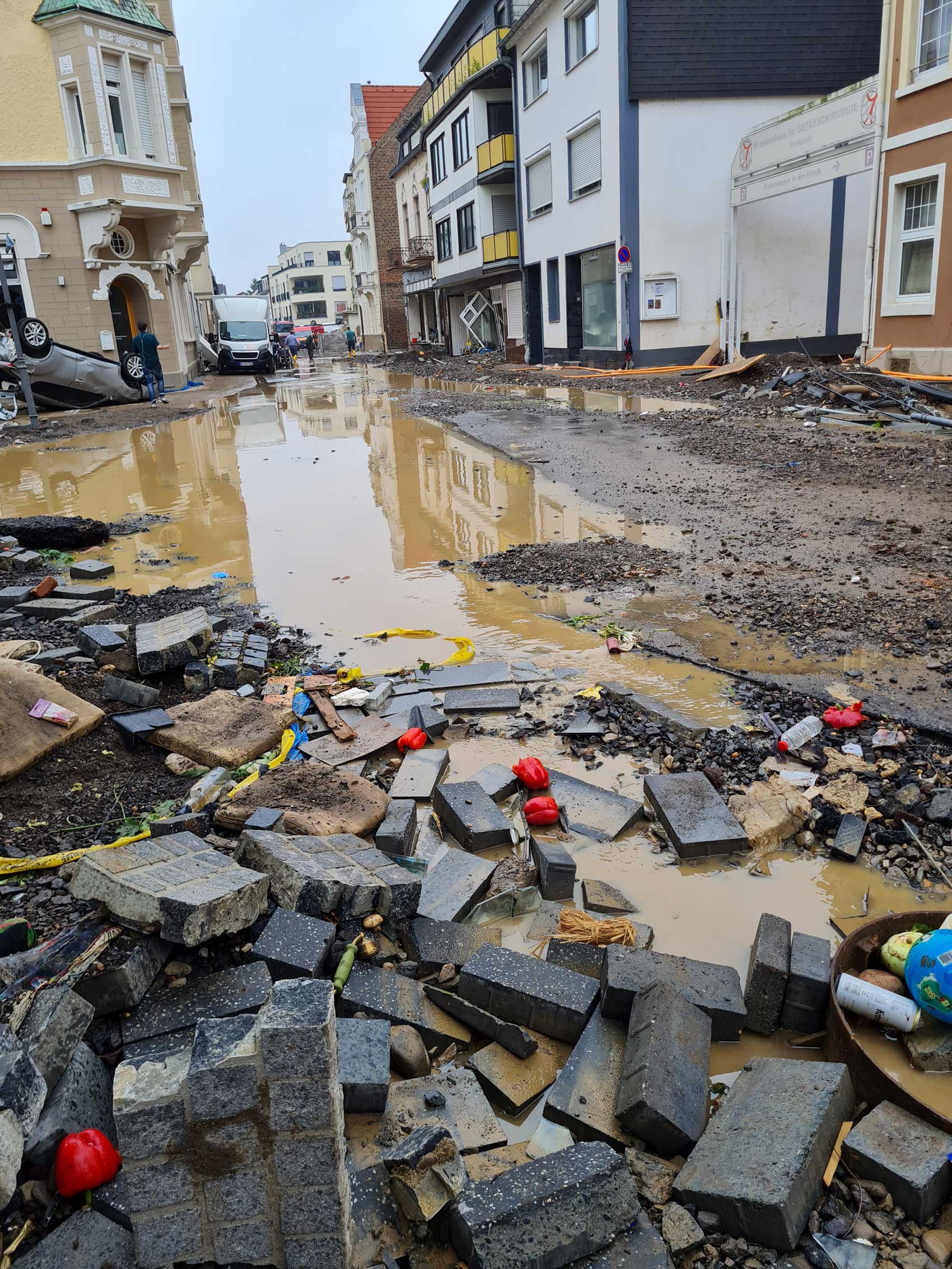 Melanie Schmickler beschreibt ein Szenario ähnlich einem Kriegsschauplatz. Niemand rechnete mit diesem Ausmaß. Es gibt teilweise keine Straßen mehr, der Asphalt ist aufgeplatzt und drückt sich in riesigen Platten an Häuserwände, Autos stapeln sich bergeweise übereinander. Das Wasser ist weg, der Schlamm ist geblieben. Es gibt keine Brücken mehr und keinen Strom. Kein Trinkwasser, kein warmes Wasser und Lebensmittel werden zum Teil in den Nachbarorten geordert.