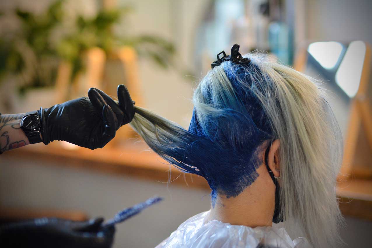• Die Haarwurzeln nun Blau einfärben (es wird durch den vorherigen Farbton dunkler).