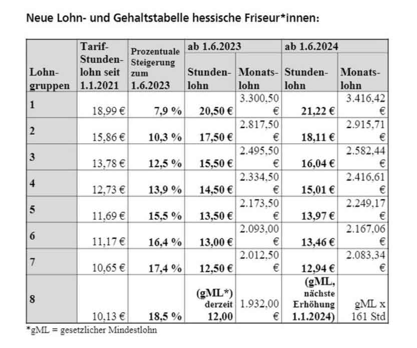 Mit dem neuen Abschluss stiegen die Stundenlöhne zum 1. Juni 2023 im Vergleich zum alten Tarifvertrag um bis zu 17,4 Prozent (Lohngruppe 7). Eine erfahrene Friseurin erhält ab Juni 2023 14,50 Euro in der Stunde und damit 13,9 Prozent mehr.
