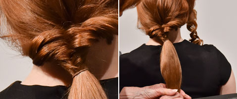 Step 5| Den Pferdeschwanz nach innen einschlagen und von unten vorsichtig durch das Loch ziehen.