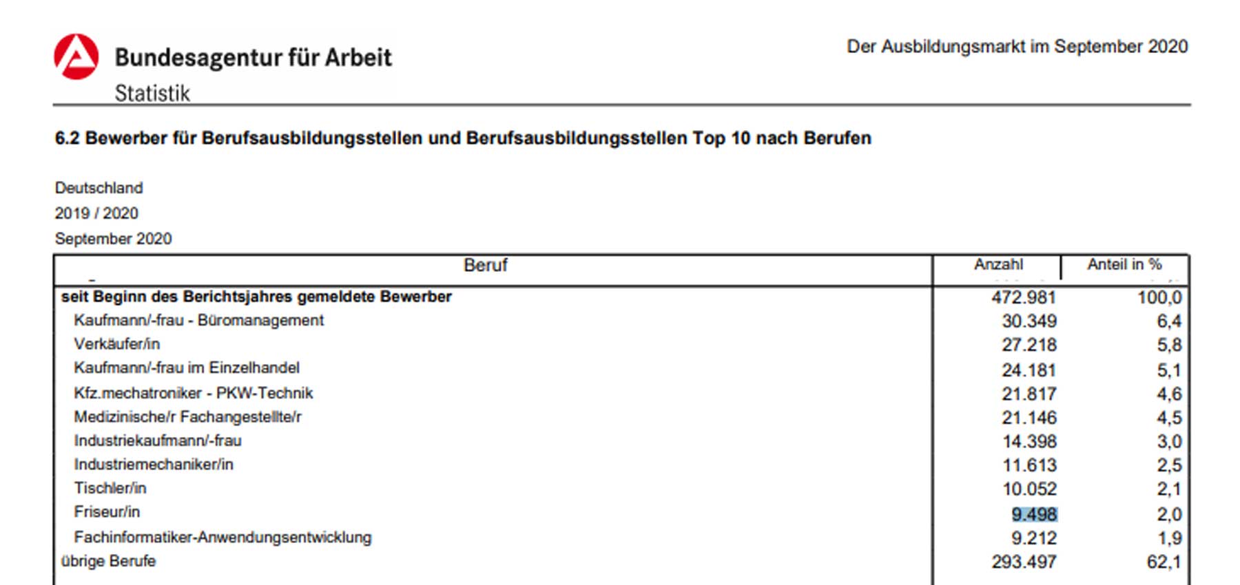 Die Zahl der unbesetzten Stellen erreichte im Corona Jahr 2020 einen neuen Höchstwert. Allein im Handwerk blieben 18.600 Ausbildungsplätze vakant. Im Friseurhandwerk bleiben sowohl überdurchschnittlich viele Bewerber unversorgt als auch Ausbildungsstellen unbesetzt. Offensichtlich gibt es hier große Diskrepanzen zwischen Angebot und Nachfrage.