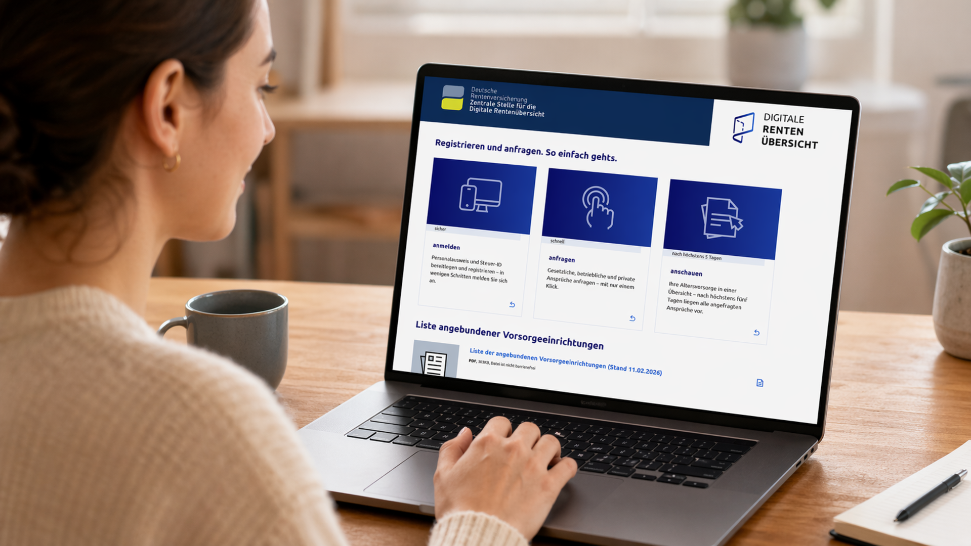 Die Digitale Rentenübersicht www.rentenuebersicht.de zeigt nicht nur die gesetzliche Rente, sondern bündelt auch Ansprüche aus betrieblicher und privater Altersvorsorge. Das Portal wird von der Deutschen Rentenversicherung Bund kostenlos bereitgestellt.