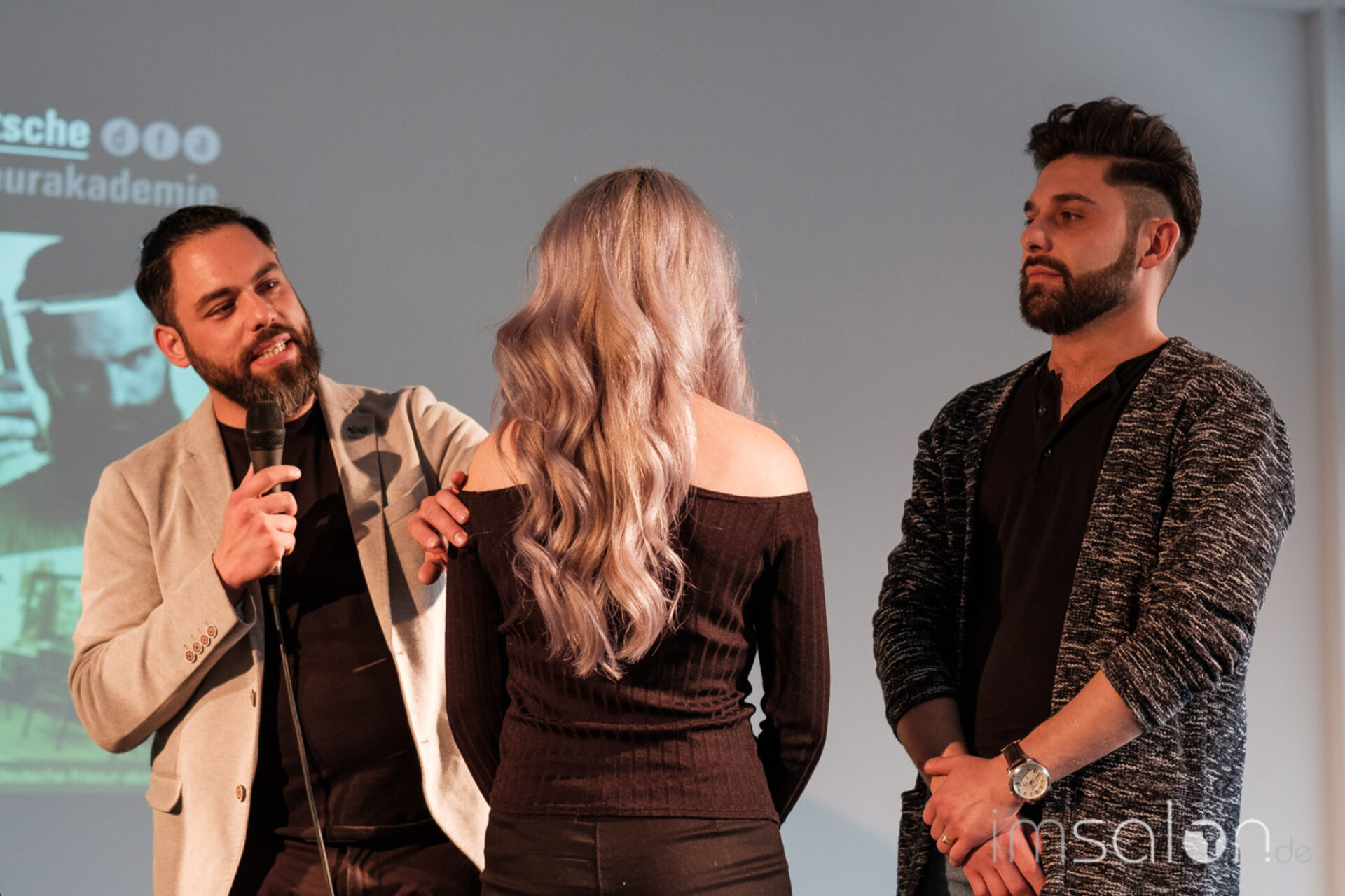 Die Trendausblicke mit dem dfa Artistic Director Mathias Napp komplettierte den Vormittag. Die neue dfa Kollektion Herbst/Winter 2017, an Live Modellen auf die Bühne gebracht. Hier an seiner Seite: Franziska Hurler, dfa Visagistin und Alexander Tsagarlis, Friseurmeister und beide angehende Friseur Trainer (HWK).