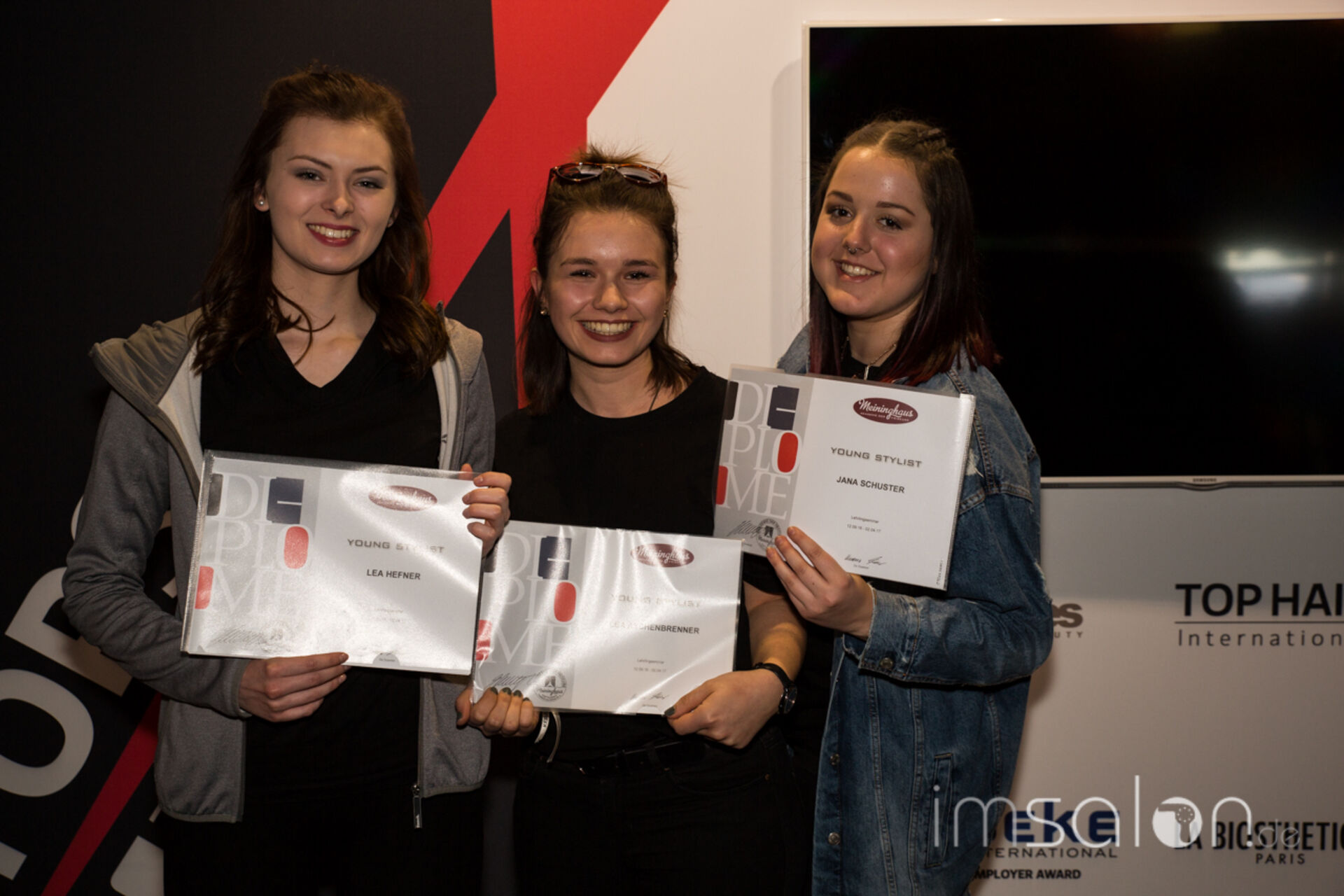 ►Axel Meininghaus, Gründer und Betreiber der Meininghaus Akademie der Friseure in Forchheim ehrt seine Auszubildenden auf der Wokshopbühne der TOP HAIR Messe und überreicht ihnen die Zertifikate zur bestandenen siebenmonatigen Ausbildung.