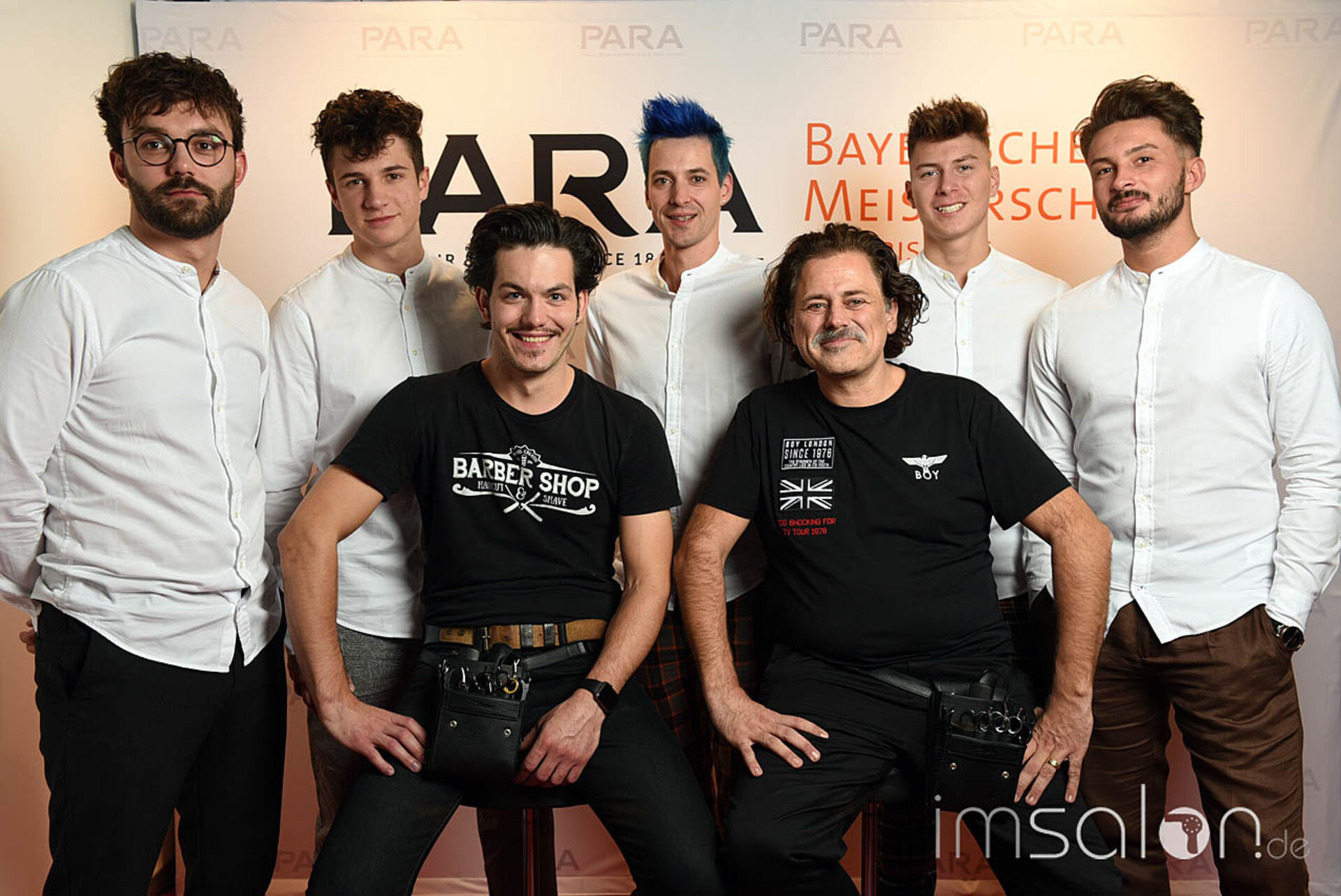 Vor der PARA Fotowand auf dem HairForum in München versammelten sich u.a. Haarkünstler, Modelle und Teilnehmer der Bayrischen Meisterschaften im Wettbewerbsfrisieren.