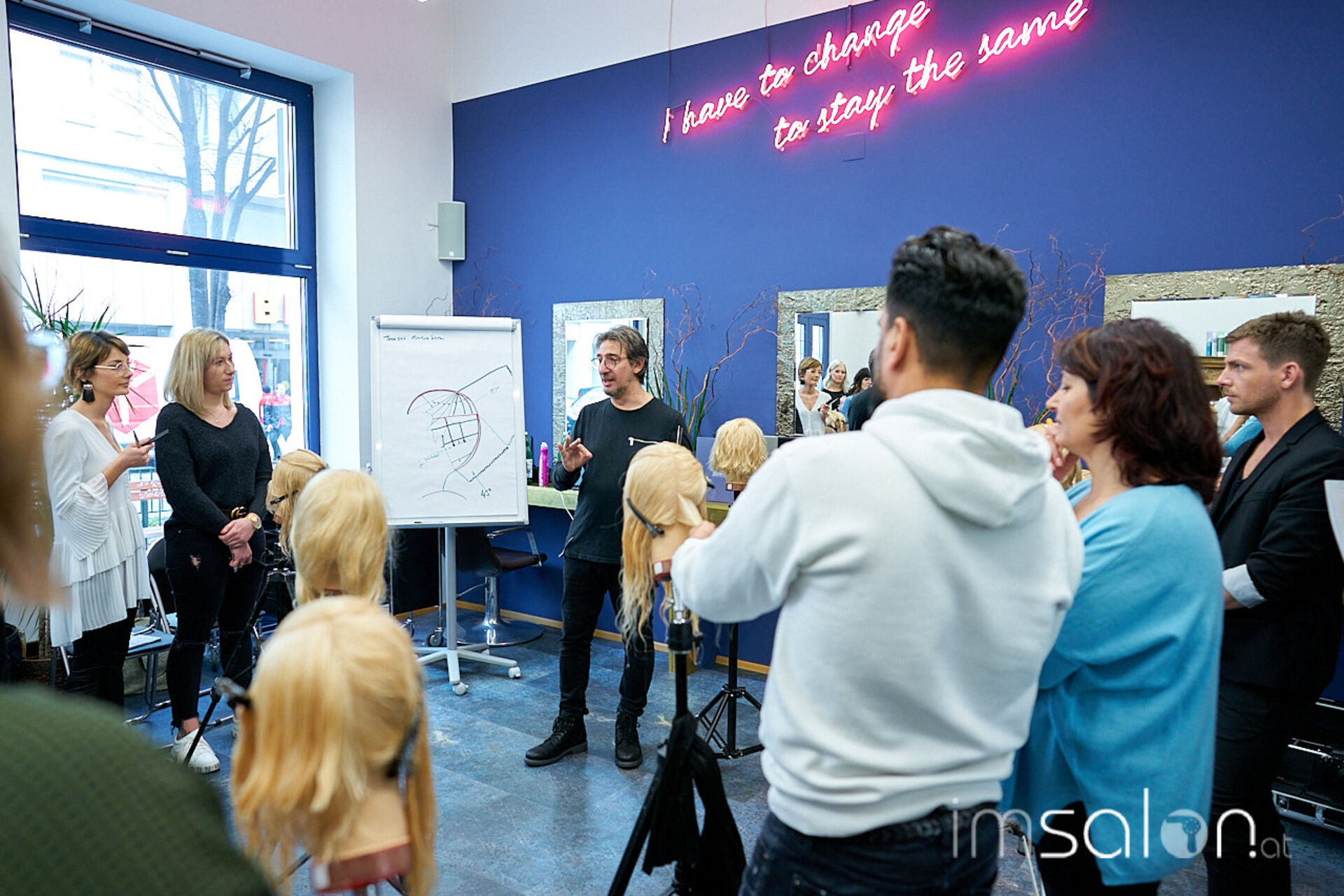 Für die Premiere des neuen Formats kommen im Wiener Salon Camaur&Brauner die Teilnehmer aus Deutschland und Österreich zum ersten Modul zusammen. Noch kennt man sich nicht, aber das ändert sich an Tag 1 relativ schnell. Denn man lebt aktives Miteinander. Das Intro gestaltet sich als 5-minütige Interviewsituation mit einem unfrei gewählten Partner aus der Gruppe. Man skizziert in einer Präsentation den jeweils anderen, dessen Background und seine Erwartungshaltungen. Frontalunterricht war gestern - ein Trainer muss präsentieren!
