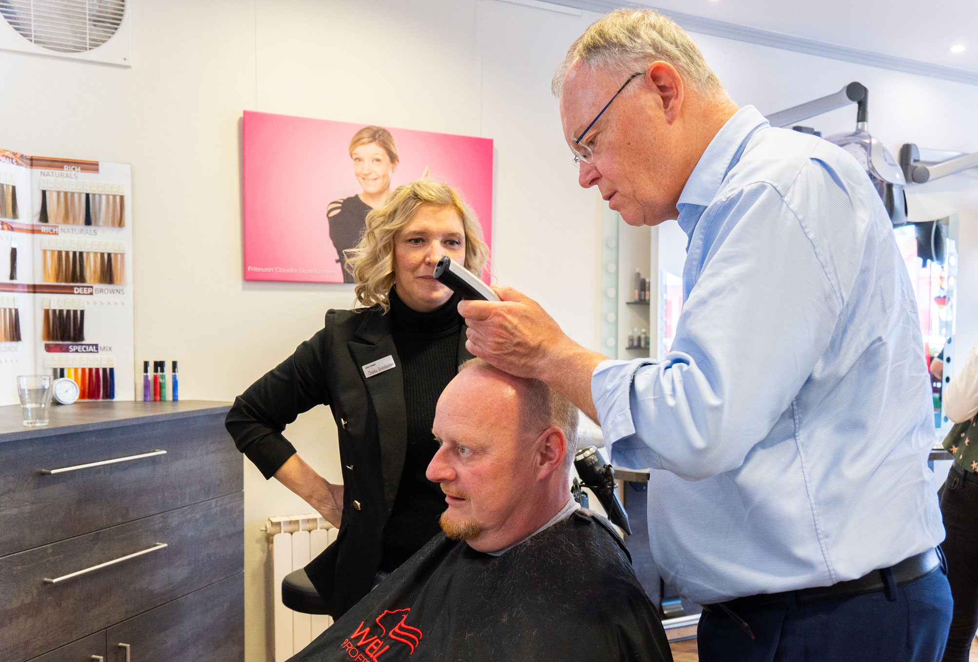 Der niedersächsische Ministerpräsident Stephan Weil besucht Friseurunternehmer und Obermeister Oliver Bremer im Salon. Zum einen, um sich einen Einblick ins Friseurhandwerk zu verschaffen und das Berufsbild kennenzulernen. Zum Zweiten, um sich intensiv nach der wirtschaftlichen Situation der Branche zu erkundigen.