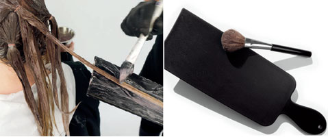 Step 1| Färben der Ansätze im weichen Verlauf zum Mittelstück. Danach wird die Farbcreme (Rezeptur 1) mit einem grobzahnigem Kamm in das Mittelstück verkämmt.