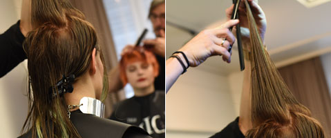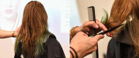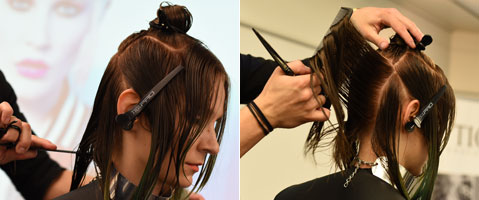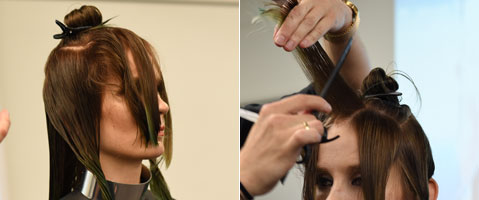 Step 12| Eine zentrale Führung für die Stufung etablieren, dafür im Point-Cut nach vorne hin leicht länger und nach hinten leicht kürzer schneiden, dabei an der Länge des unteren Bereichs orientieren. Das restliche Haar zur Mitte hin überziehen und gleichmäßig im Point-Cut schneiden.