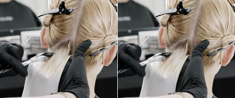 Step 4| Um fortzufahren, teile horizontale Passees ab und trage Rezeptur 1 vom Ansatz bis in den mittleren Bereich auf. Nutze dafür die Root-Stretching-Technik. Mit einer Freehand-Blending-Technik wird Rezeptur 2 in die Längen und Spitzen gearbeitet.