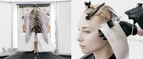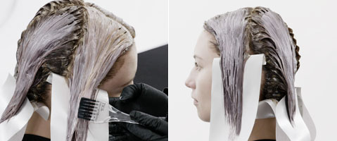 Step 3| Arbeite die ersten Passees in diagonalen Abteilungen und appliziere Rezeptur 1 vom Ansatz bis in die Spitzen. Mit einer Freehand-Blending-Technik wird Rezeptur 2 in die Längen und Spitzen gearbeitet.