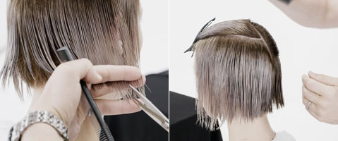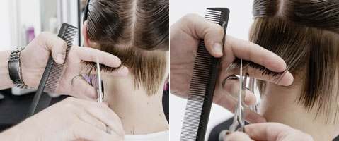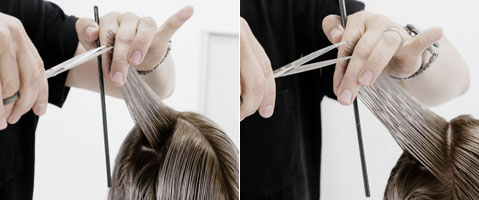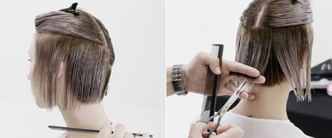 Step 2| Zwei horizontale Partien von unter dem Okzipital-Knochen bis zur Mitte der Ohren abteilen. Haare im natürlichen Fall kämmen, auf 45 Grad abheben und im Point-Cut parallel zum Scheitel schneiden um im Nacken eine horizontale Graduation zu erhalten.