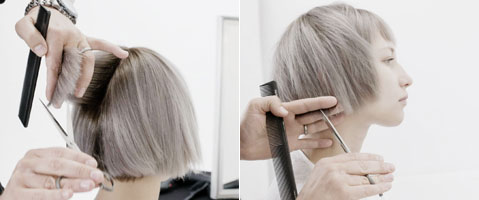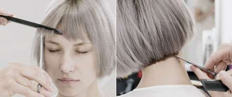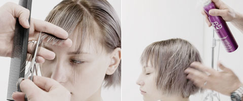 Das Haar mit Dumb Blonde Shampoo & Reconstructor waschen. Control Freak Serum als Schneidelotion auftragen.