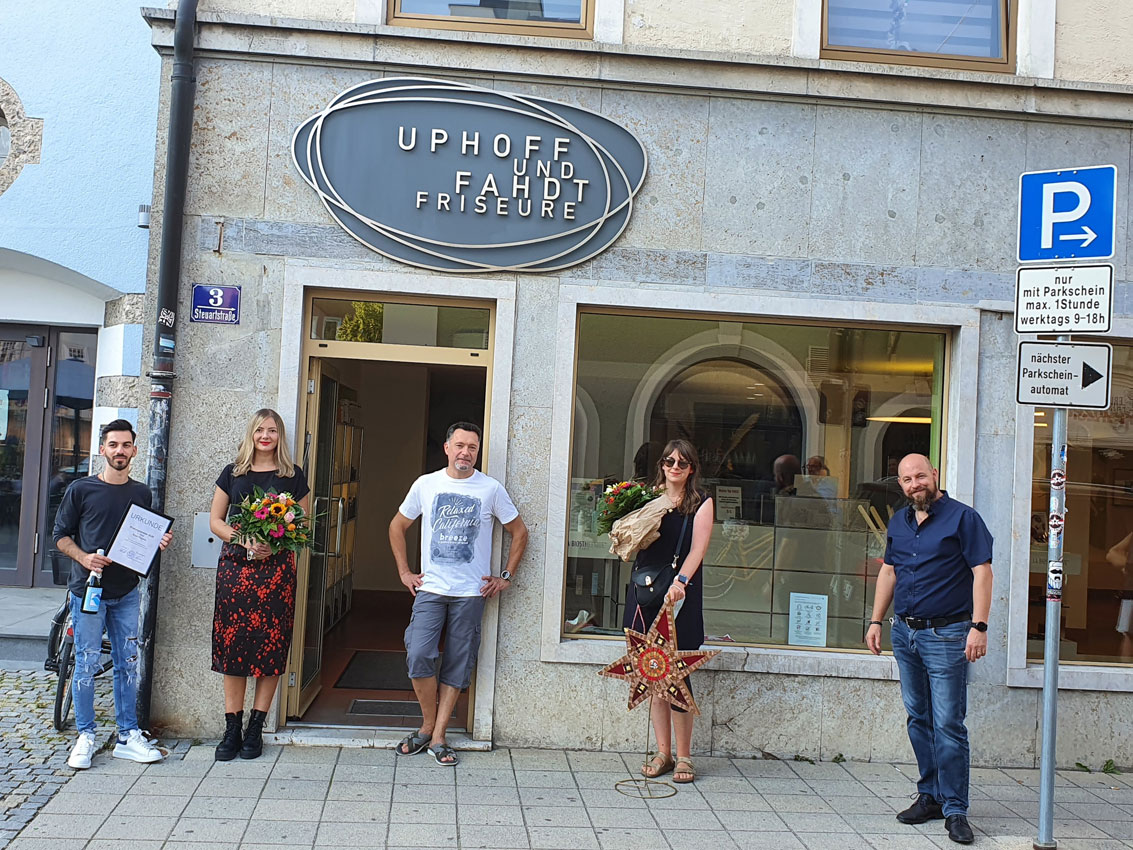 Für Enzo Pagano brachte es den Titel "Prüfungsbester", seinem Ausbildungssalon Uphoff und Fahdt bereits zum dritten Mal den Ausbildungs-Wanderstern. Das Team um Marie Fahdt darf ab sofort den Titel „Bester Ausbildungsbetrieb der Friseurinnung Ingolstadt-Pfaffenhofen“ tragen. Der Wanderstern ehrt jährlich den besten Ausbildungsbetrieb. Die aktuelle Preisträgerin Johanna Legler (Salon Legler) übergab diesen an ihre Nachfolgerin Marie Fahdt, bei der der Wanderstern zuküftig auch bleiben wird, denn nach der dritten Auszeichnung verbleibt dieser im Salon.