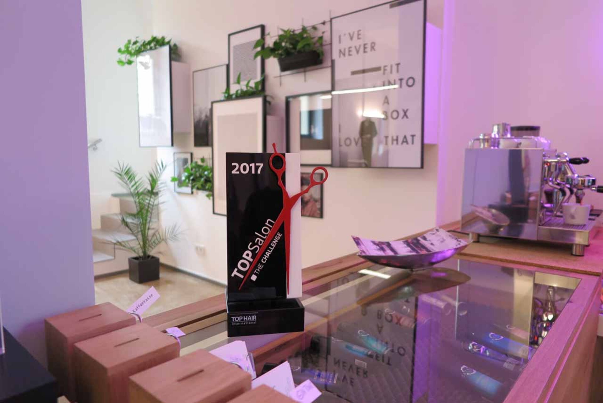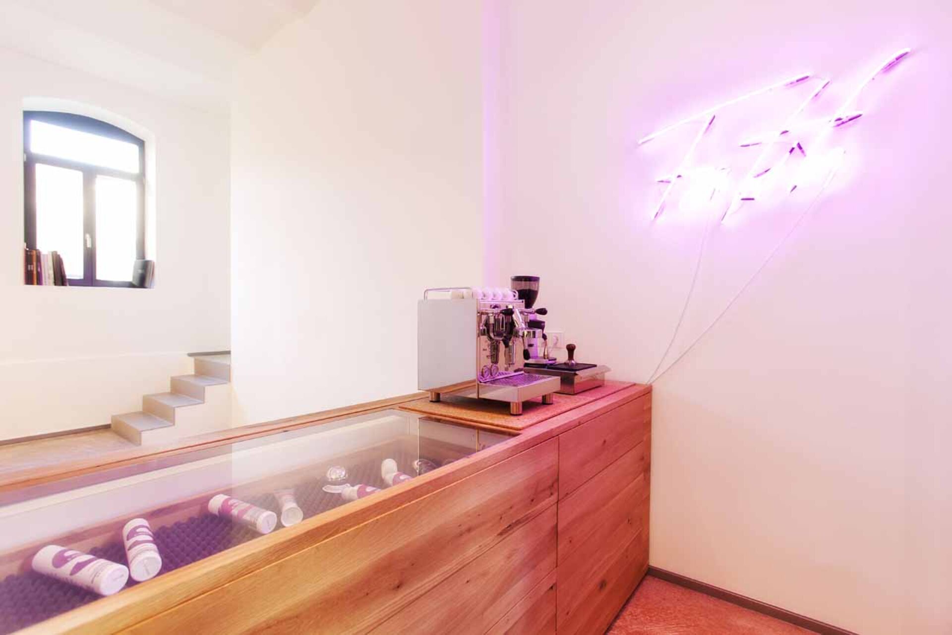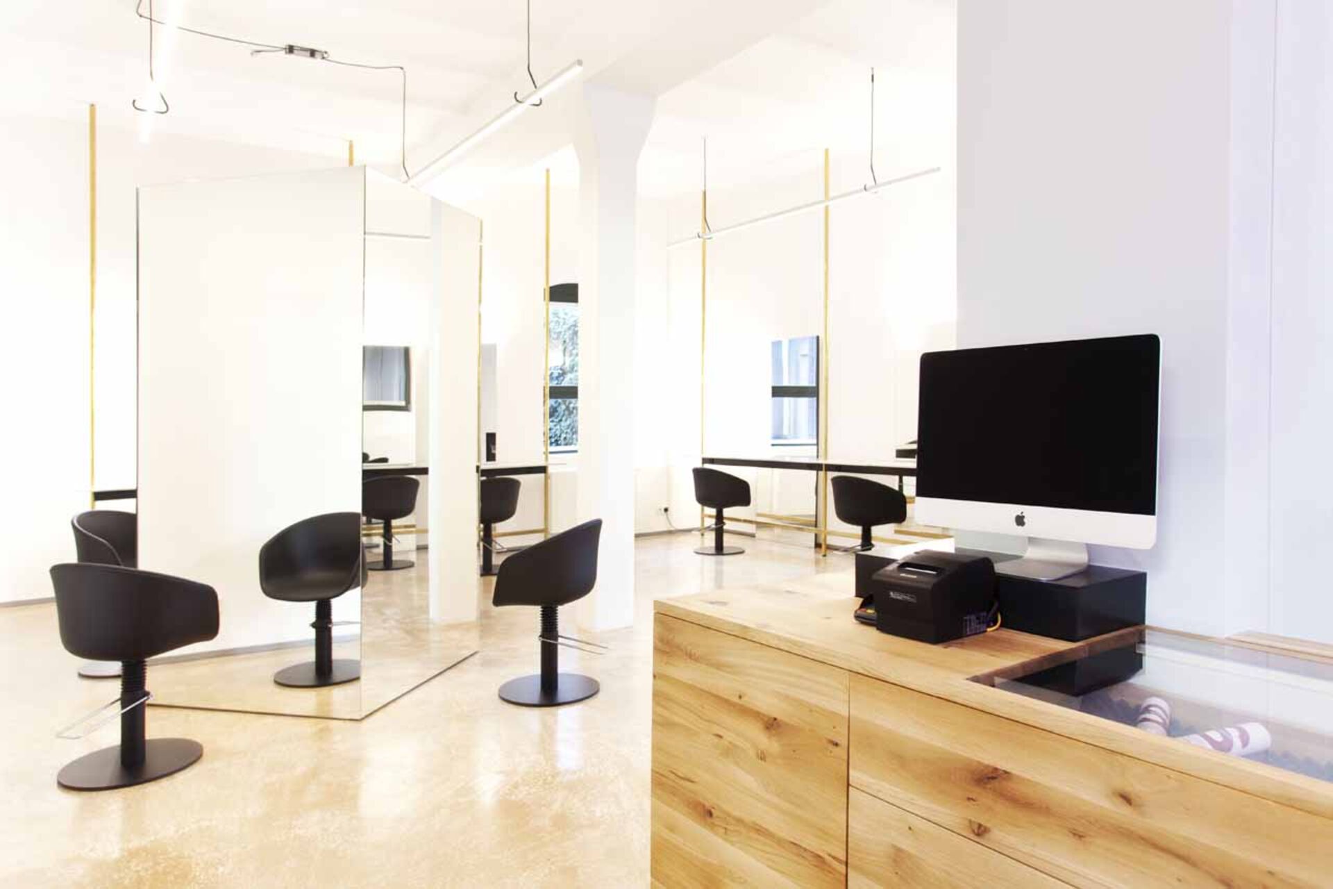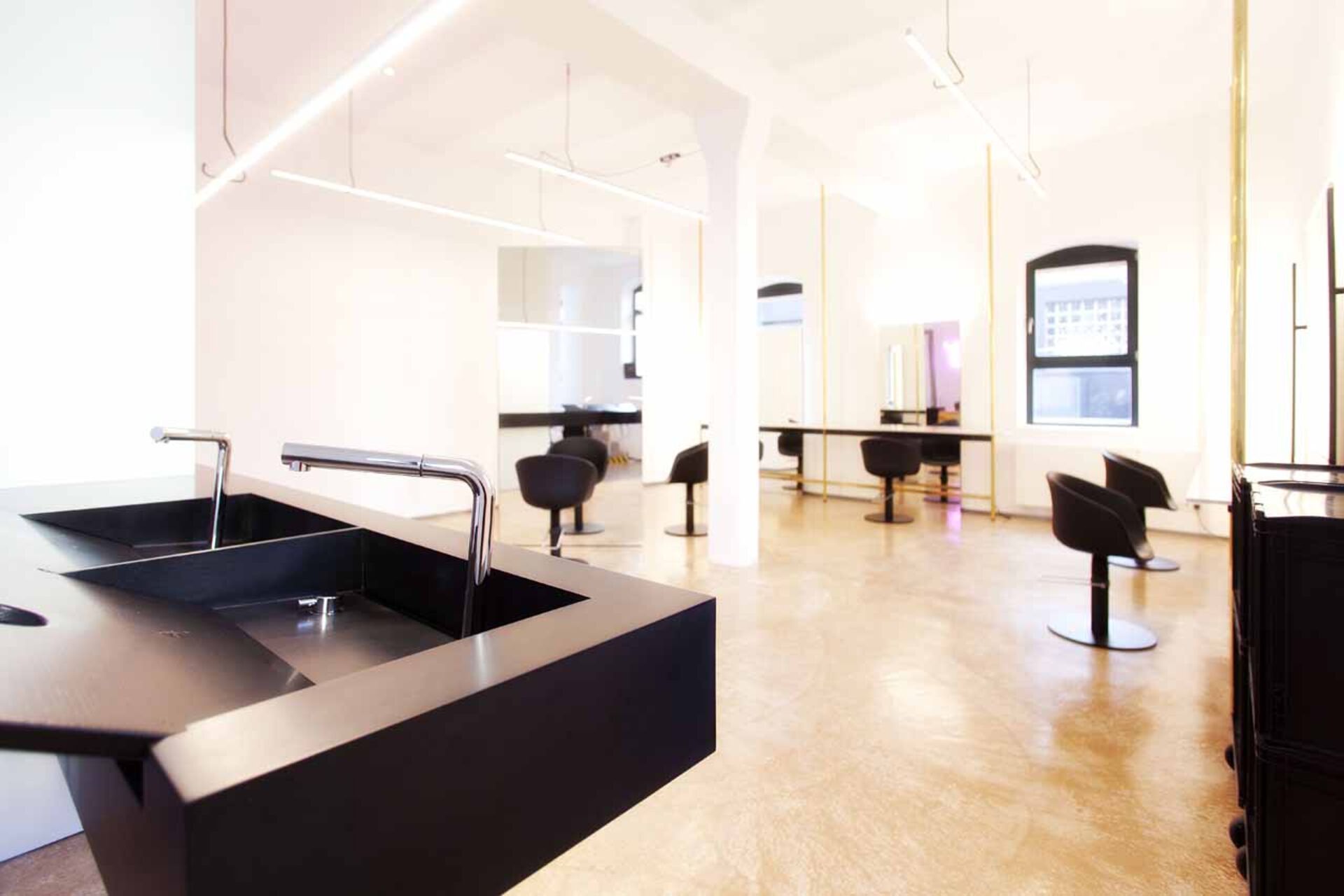 Vom handschriftlich designten Logo, über das selbst gebaute, freischwebende Waschbecken bis hin zum eyecatchy Spiegelkubus, der gleichzeitig als Stauraum für Farben dient, ist in Fatih Erbay's Salon "Fatih Hairdressing" in Stuttgart nichts einfach nur "Standard". Das Interieur strotzt vor Einzigartigkeit, selbst ausgedachten Unikaten und man erkennt Fatihs Handschrift durch die Liebe zum persönlichen Detail. Messingrohre, die sich durch den Salon ziehen, schaffen einen Stilbruch zur handgemachten Vollholz-Bedientheke aus Eiche. Weiße Marmorplatten, die als Ablagen an den Schneideplätzen dienen, verbreiten edle Noblesse.
