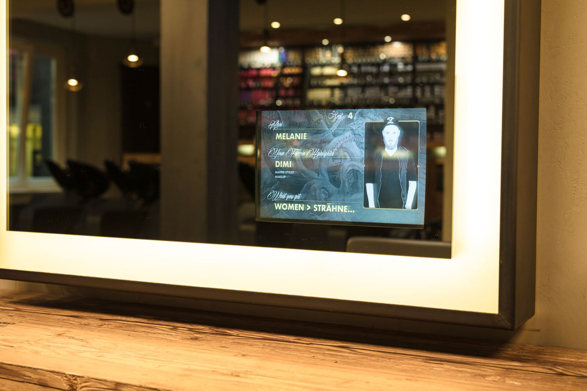- Ein Display in jedem Spiegel zeigt den Namen des jeweiligen Kunden, seines Hairdressers und die gebuchte Leistung.