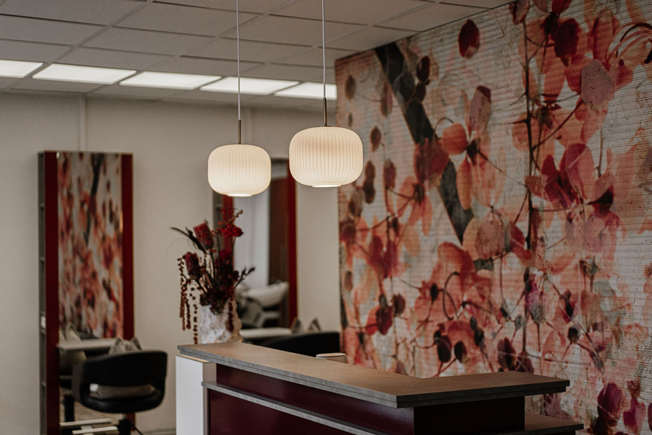 Lisa Tribelnig-Matzner setzt in ihrer zweiten Stuhlmiete-Dependance auch auf Japandi sowie New Retro Elemente. Im Neubau treffen Reduktion und ikonische Elemente aufeinander. Die Wände in Kalkputz-Optik stehen einer Akzentwand, die als Raumtrenner fungiert, mit Kirschblüten gegenüber. Der Empfangsbereich ist in sattem Burgunderrot gestaltet, darüber sorgen Pendelleuchten mit geriffeltem Glas für warmes Licht.