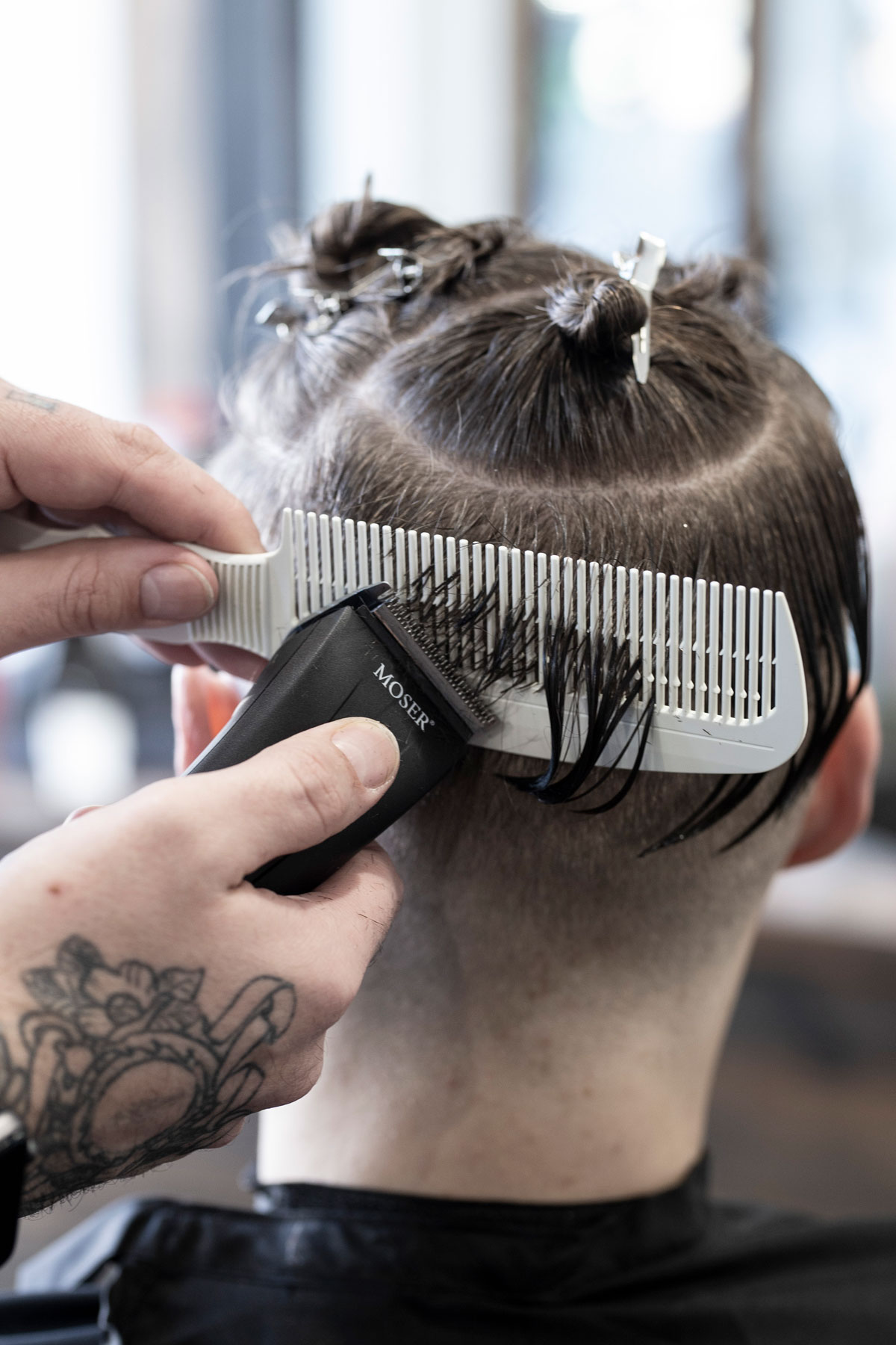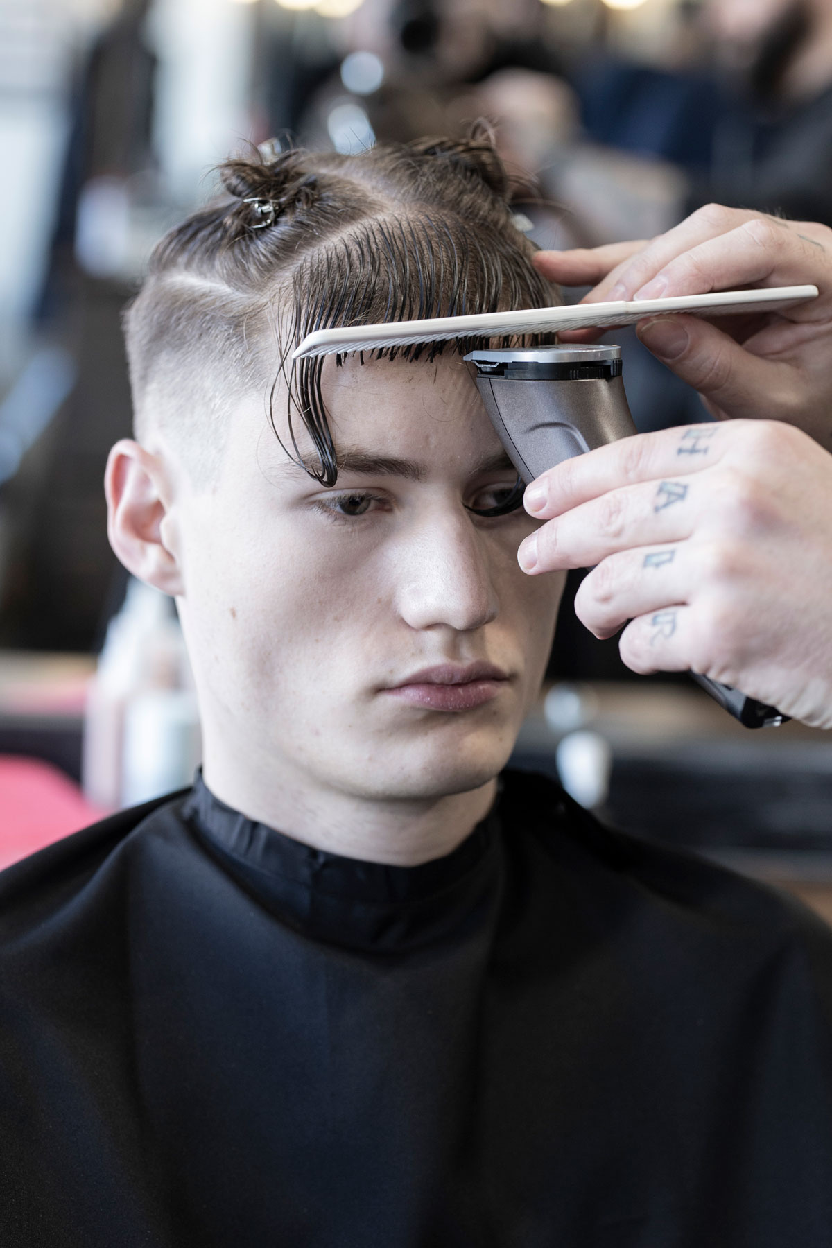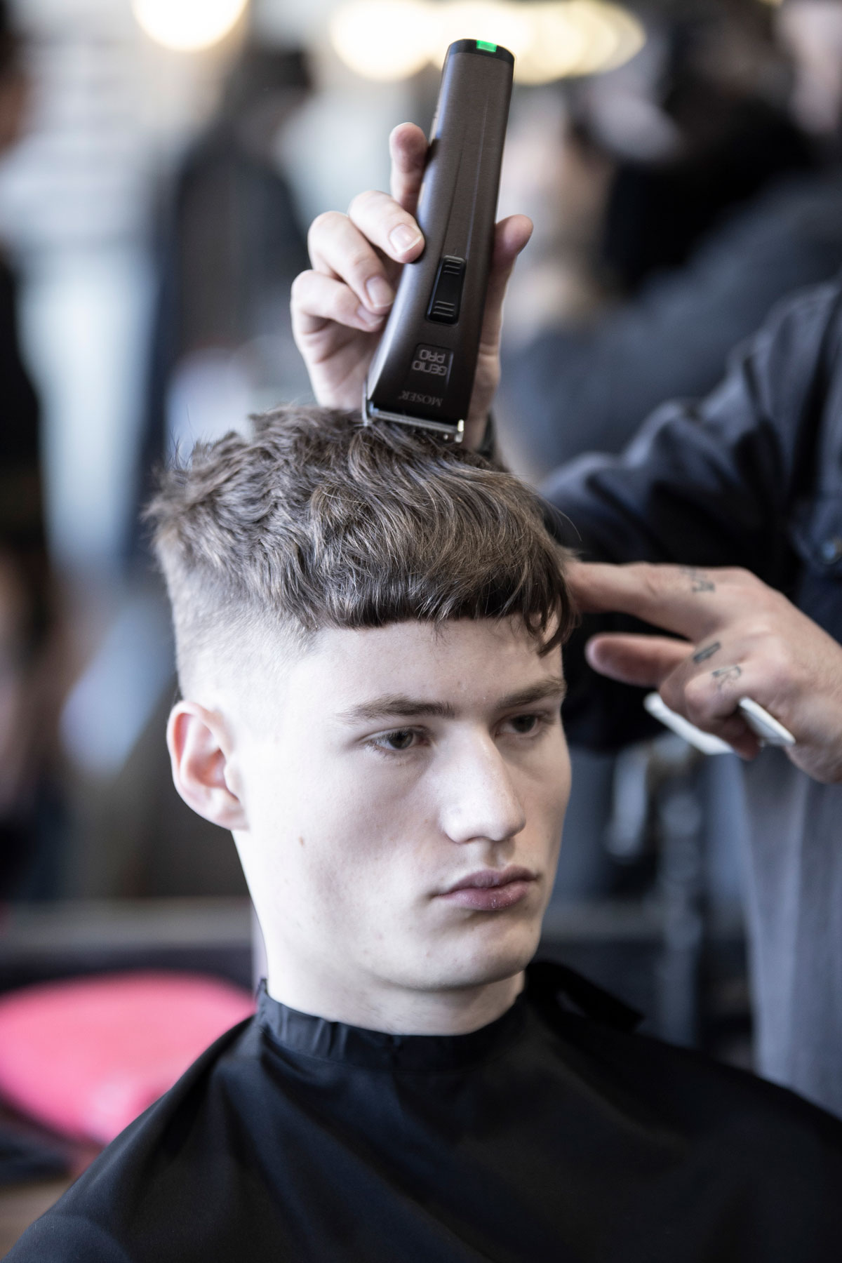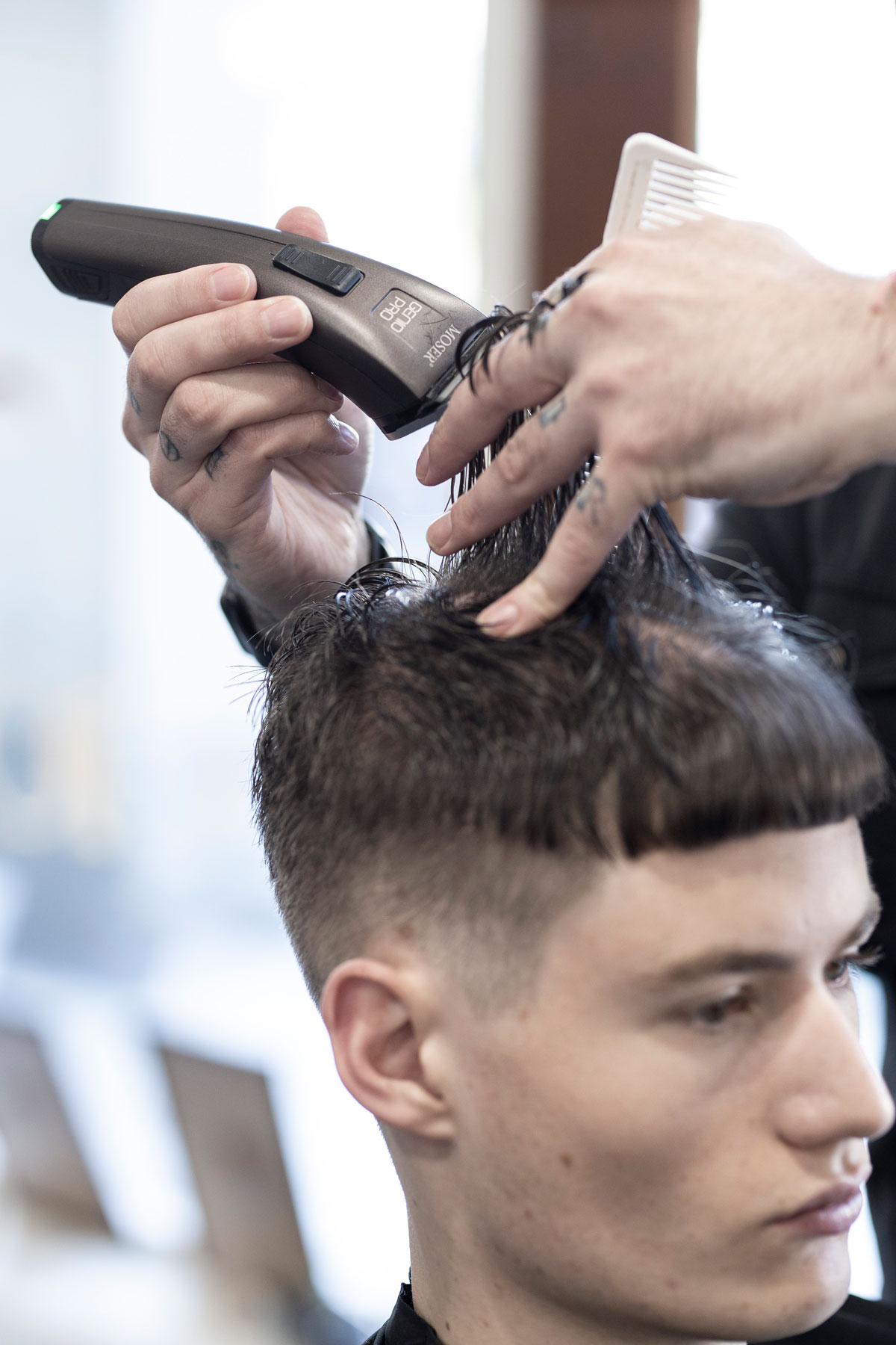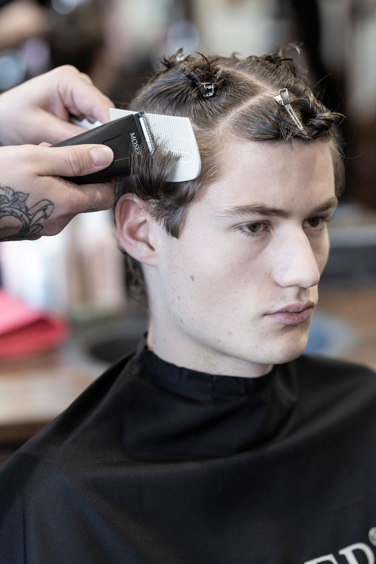 Der Schnitt made by MOSER verbindet verschiedene Stylingelemente wie einen maskulinen Fade im Nacken- und Seitenbereich, wild gestyltes Deckhaar mit perfekter Textur und kreative Akzente im Vorderkopfbereich.