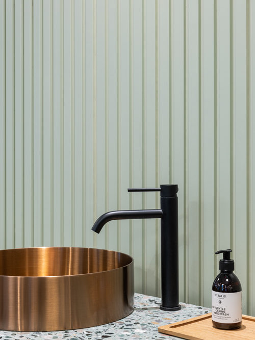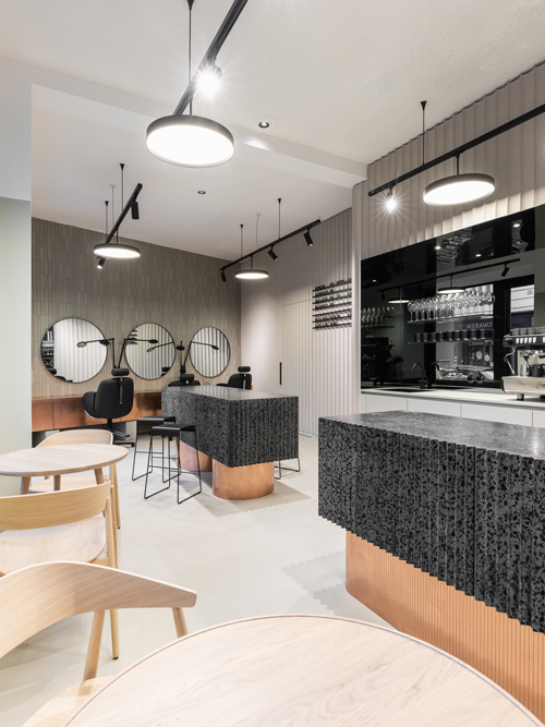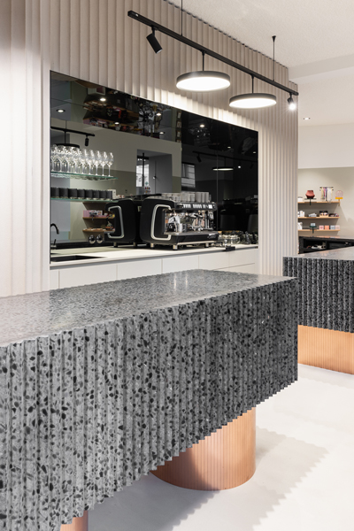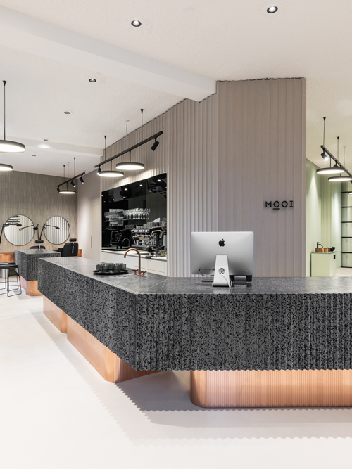 Daniel Hora über seine Arbeit am Store: „Wichtig war uns, natürliche Materialien zu verwenden, die dennoch ein Farbenspiel zuließen. So entschieden wir uns für ein Terrazzokonglomerat aus verschiedenfarbigen Basaltsteinen in einer „Mooi-grünen“ Füllmasse. Das reine Kupfer mit seiner metallischen Spiegelung setzten wir als Schmucktupfen ein, um dem Raum einen edlen Schliff zu verleihen. Als ruhige Basis für ein klares Organisieren und Zonieren in den verschiedenen Funktionsbereichen des Stores dienen die gewellte Betonwand und die Betonbodenbeschichtung. Die Industrieelemente der Glastrennwand und die verschiedenen Lichtobjekte an der Decke, Wand und an den Möbeln verkörpern den jungen, dynamischen und professionellen Charakter von Mooi.“