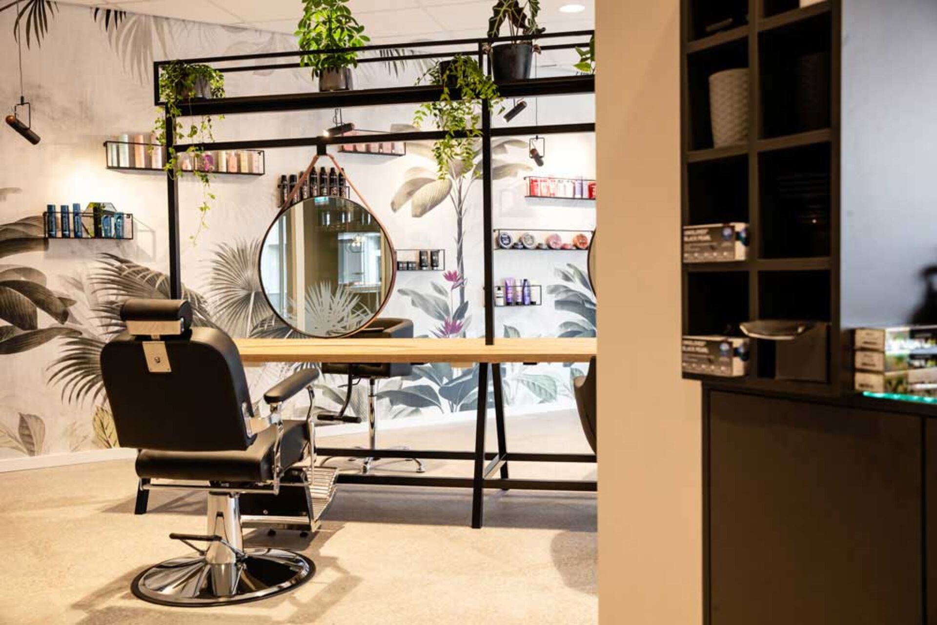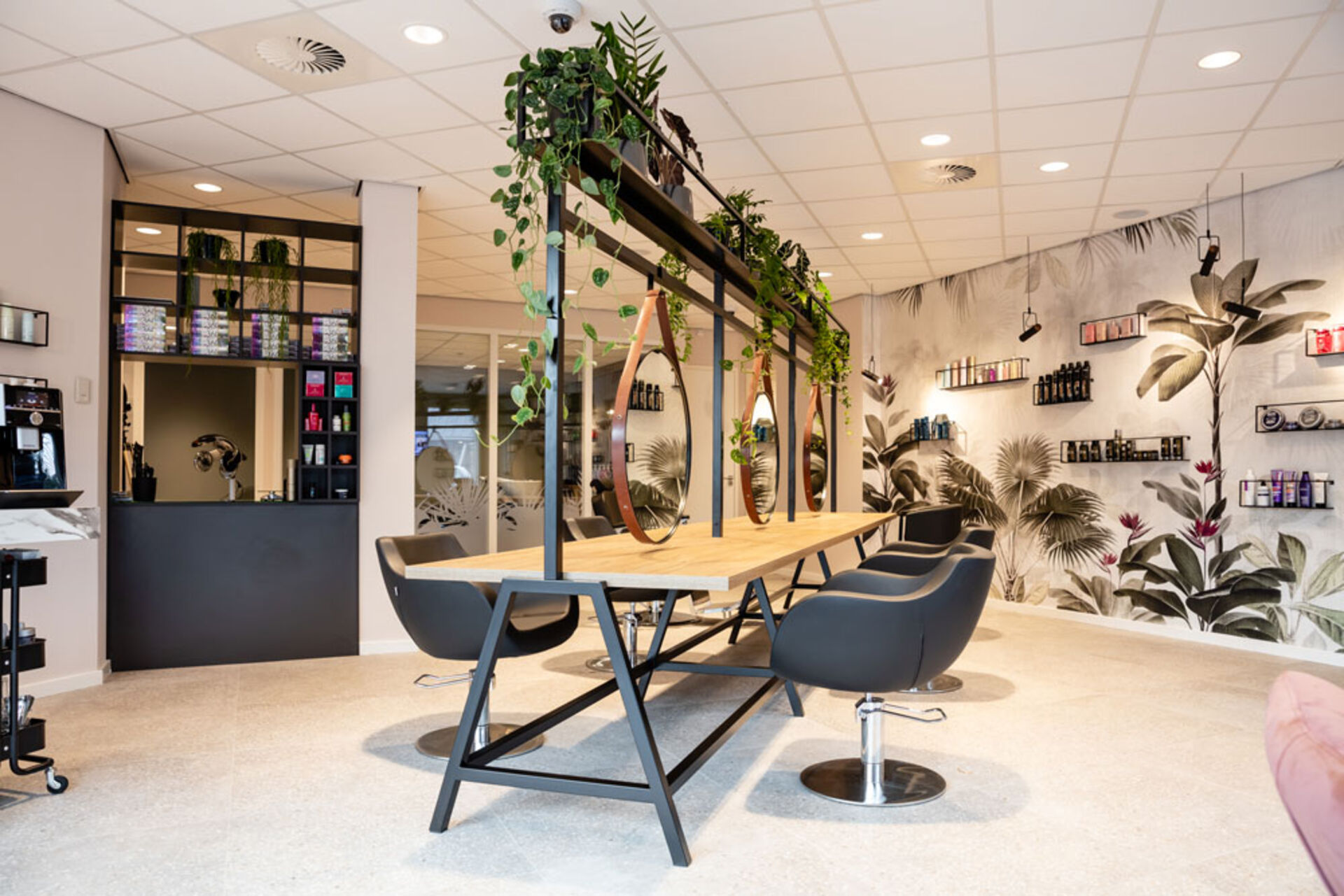 Dieses Design spricht für sich: saftig-grüne Pflanzen, die von dem schwarzen Spiegel-Stahlgerüst herunterwachsen und Tapeten, die mit aufgemalten Urwaldpflanzen bestückt sind – das nennt man Dschungelfieber im niederländischen Salon Tease. Die Mischung aus braunen Eichenholzelementen und schwarz lackiertem Stahl bringen die gewollten rustikalen Vibes in den Raum. Ein paar dunkle Ledersessel, die vielen Pflanzen und eine braune Mosaikwand im Haarwaschbereich, sorgen für ein ebenfalls rustikales, aber naturverbundenes Design. Exotisch wird es mit der Tapete – Palmen und Blumen sind zu sehen, die das Urwaldfeeling umso mehr in den Salon bringen. Urlaub im Dschungel während eines Friseurbesuchs, na das klingt doch nach Entspannung!