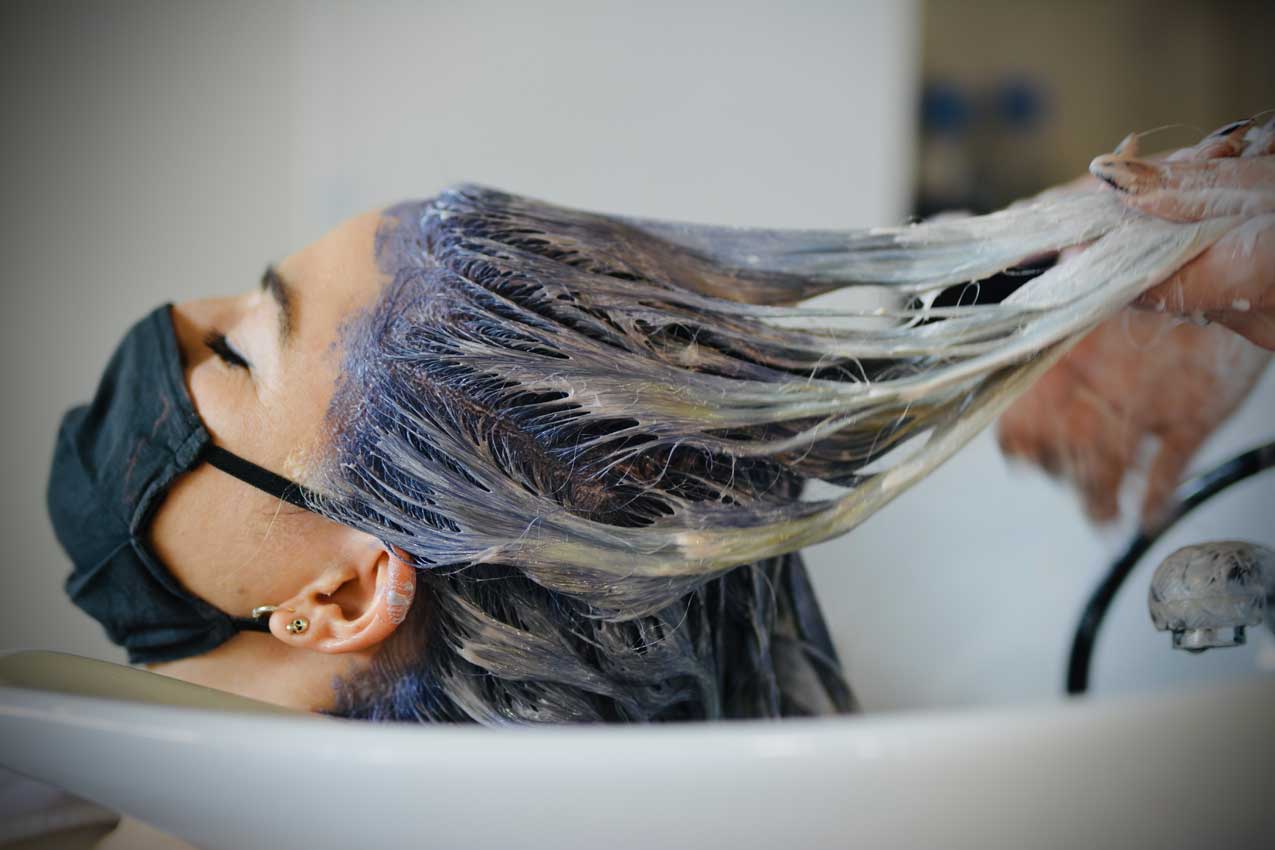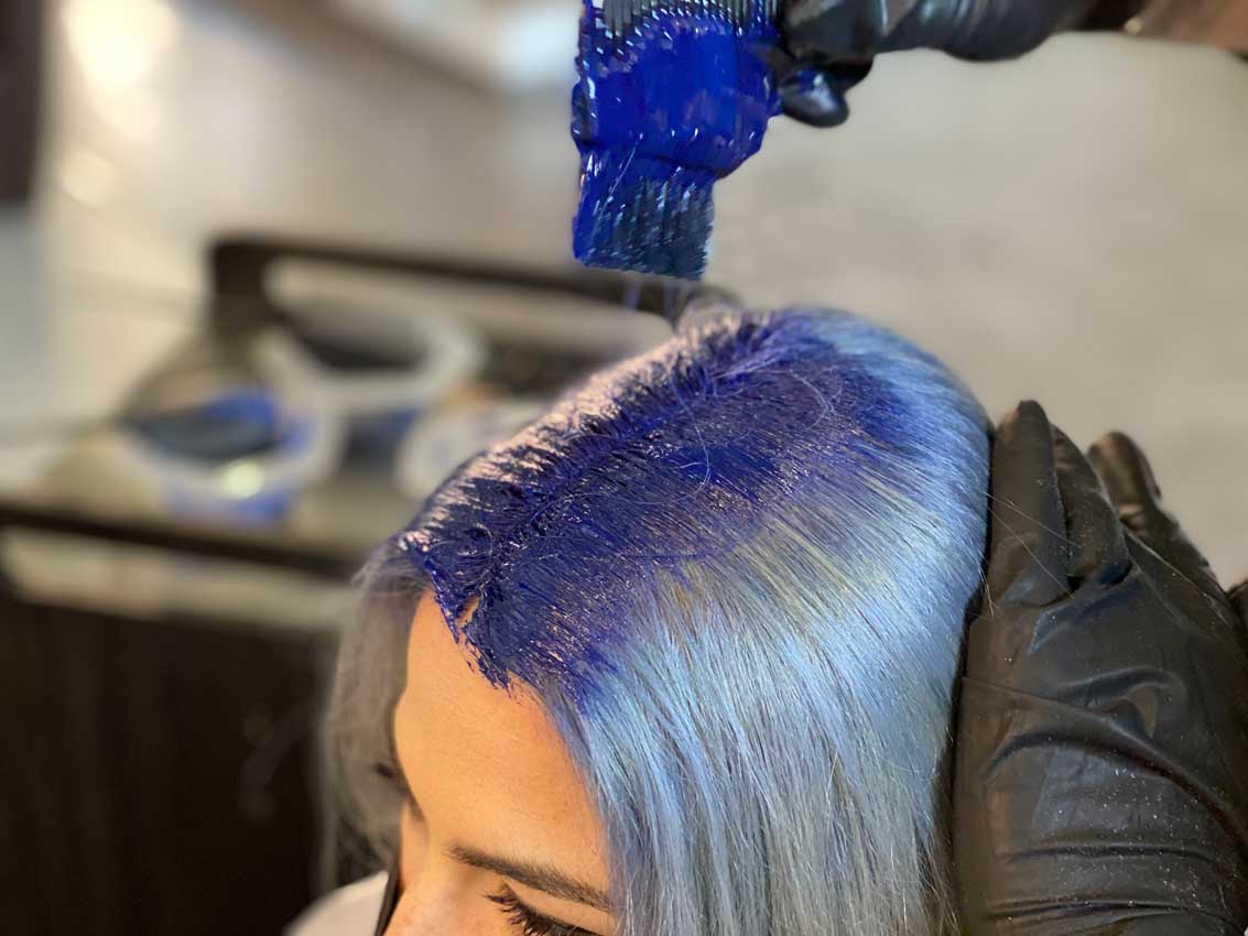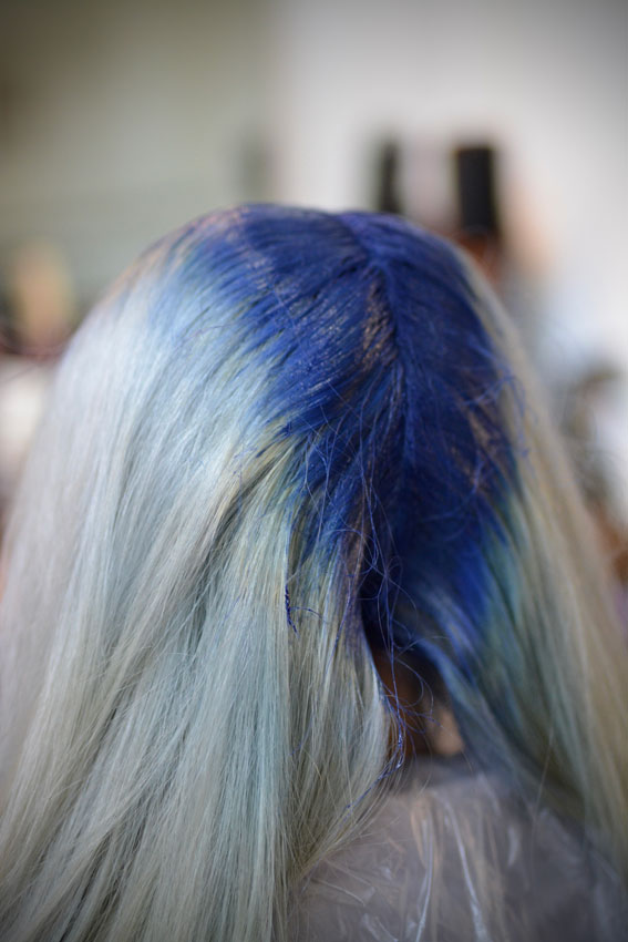 • Die Haarwurzeln nun Blau einfärben (es wird durch den vorherigen Farbton dunkler).