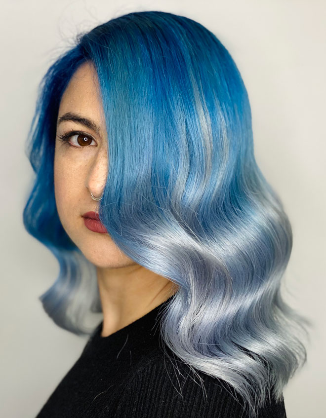 • Färbe die Längen mit dem gleichen Blau und die Spitzen mit Perlmutt.
