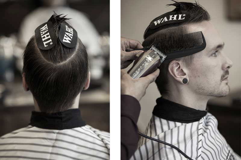 Step 3 & 4 | Mit den Aufsteckkämmen 4,5 mm bis 1,5 mm einen hautnahen Übergang im gesamten Nacken- und Seitenbereich ausarbeiten. Anschließend die Konturansätze der Nacken- und Seitenbereiche nach oben hin verlaufend ausrasieren.