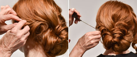 Ausschließlich den Gummi mit einem Bobby-Pin fixieren und in eine harmonische Form zupfen.