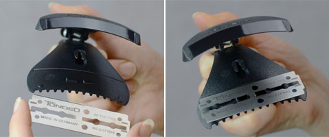 Der BLAZOR („Blade“+„Razor“) - made by Tondeo - schreibt keine bestimmte Arbeitstechnik vor und lässt viel Raum für eigene Kreativität. Für Handhaltung und Arbeiten gilt: Er wird intuitiv und individuell gehandhabt - ganz ohne Schulung. Durch die Nähe der Hand zur Klinge ist gefühlvolles Arbeiten möglich, so dass die Schnitt-Effekte mit Fingerspitzengefühl variierbar sind: weiche Grundlänge, fließende Übergänge, das Setzen modischer Akzente - alles möglich! Mitentwickler Ron Schumann, Friseurmeister aus Coesfeld, ist überzeugt: „Die gebogene Klinge sorgt für ein Maximum an Stabilität für exaktes Arbeiten!“