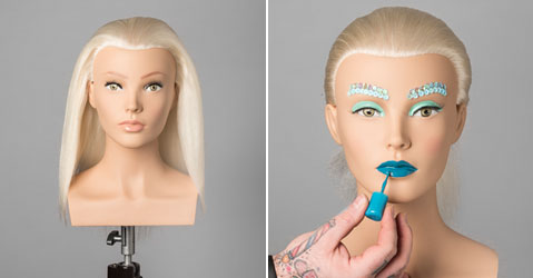 Step 1| Die Lippen werden mit Nagellack bearbeitet, auf die Augenbrauen werden mit Sekundenkleber Pailletten aufgeklebt, die Wimpern werden mit künstlichen Wimpern verdichtet.