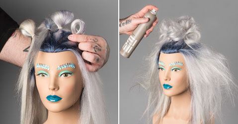 Step 9| Den glatten Seiten- und Hinterkopfbereich mit den Fingern auftoupieren, alles mit Glanzspray einsprühen und mit Haarspray fixieren.