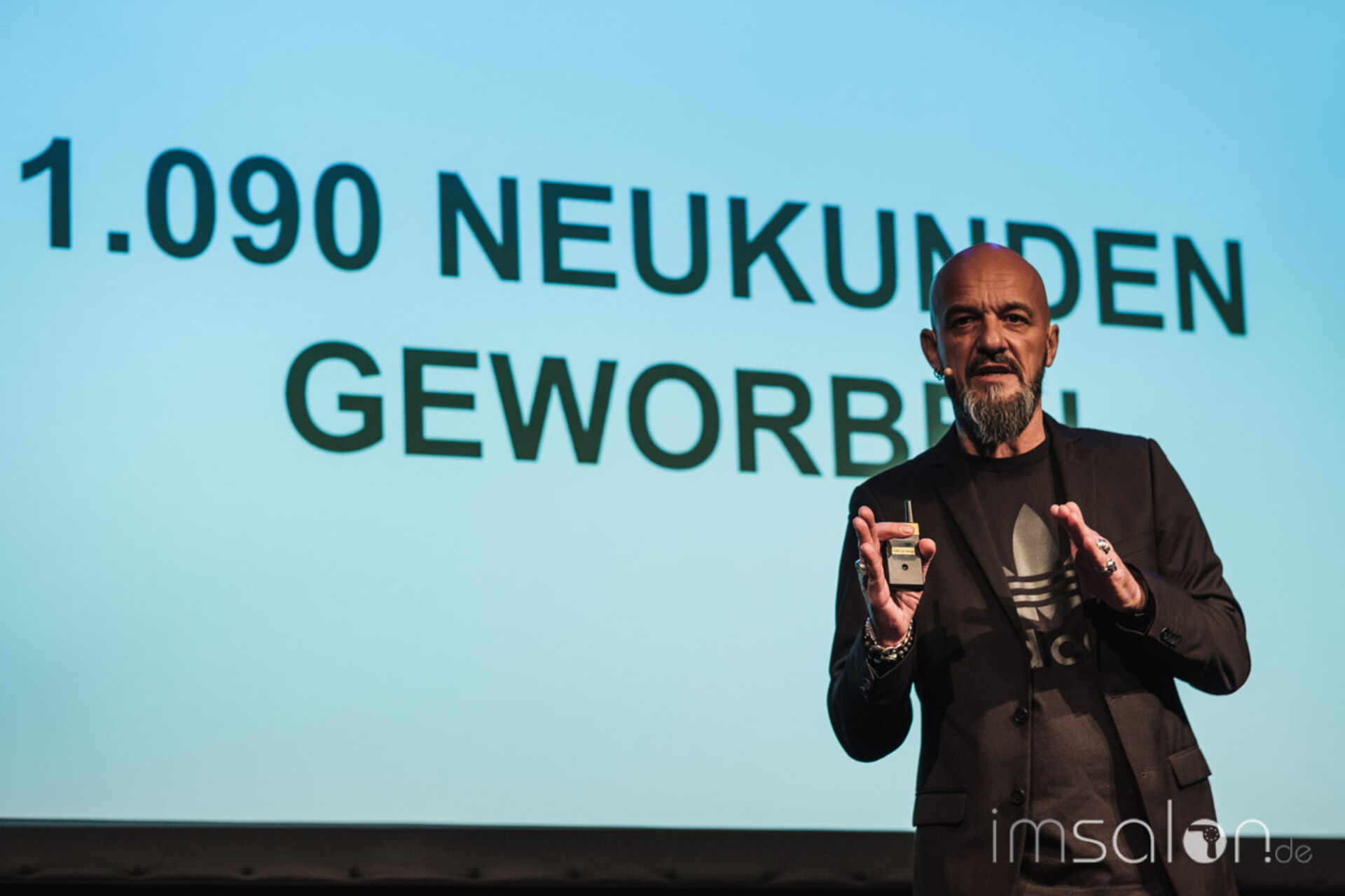 Mit Charme und Witz präsentiert Frontmann Achim Rothenbühleraktuelle Unternehmenszahlen zu Gesamtumsatz, Mitarbeiterinterna und Neukundengewinnung durch neue Salonkonzepte.
